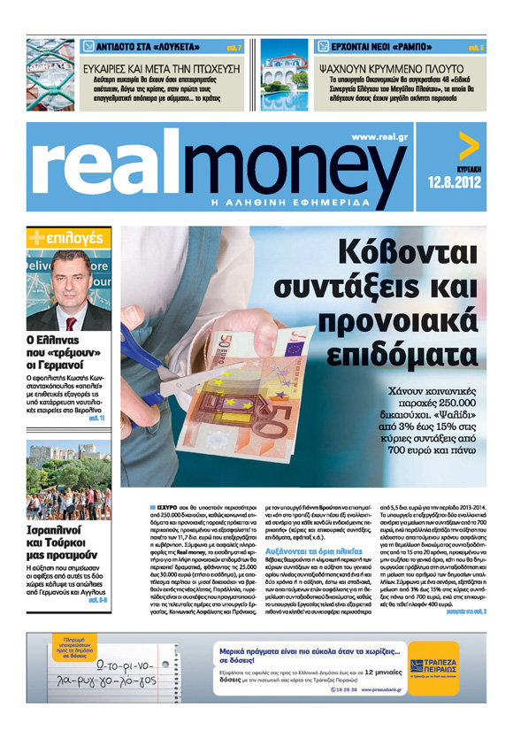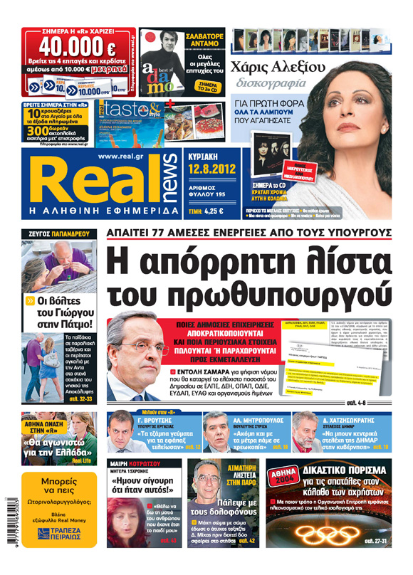 Με τίτλο: “Η απόρρητη λίστα του πρωθυπουργού” κυκλοφορεί σήμερα η Realnews, η οποία αποκαλύπτει το πολυσέλιδο έγγραφο με τις 77 ενέργειες που απαιτεί άμεσα από τους υπουργούς του ο Αντώνης Σαμαράς.Ποιες δημόσιες επιχειρήσεις αποκρατικοποιούνται και ποια περιουσιακά στοιχεία πωλούνται ή παραχωρούνται προς εκμετάλλευση. Εντολή Σαμαρά για ψήφιση νόμου που θα καταργεί το ελάχιστο ποσοστό του Δημοσίου σε ΕΛΠΕ, ΔΕΗ, ΟΠΑΠ, ΟΔΙΕ, ΕΥΔΑΠ, ΕΥΑΘ και οργανισμούς λιμένων.Το κύριο άρθρο της εφημερίδας και του Νίκου Χατζηνικολάου έχει τίτλο “Εθνική τραγωδία!” και αναφέρει συγκεκριμένα: “Το αυτοκίνητο τρέχει με 250 χιλιόμετρα την ώρα προς τον γκρεμό και οι έχοντες την ευθύνη της πορείας του, αντί να πατήσουν το φρένο και να στρίψουν το τιμόνι, για να αποφευχθεί έστω και την τελευταία στιγμή το… μοιραίο, αλληλοϋπονομεύονται και αλληλοϋποβλέπονται”.Επίσης στη Realnews μπορείτε να διαβάσετε:- Οι βόλτες του Παπανδρέου στην Πάτμο! Τα παϊδάκια σε παραλιακή ταβέρνα και οι περίπατοι αγκαλιά με την Αντα στα στενά σοκάκια του νησιού της Αποκάλυψης.- Ο υπουργός Εργασίας Γιάννης Βρούτσης δηλώνει: “Τα τζάμπα γεύματα για τα εφάπαξ τελείωσαν”.- Ο βουλευτής του ΣΥΡΙΖΑ Αλέξης Μητρόπουλος προβλέπει: “Ακόμη και με τα μέτρα πάμε σε χρεωκοπία”.- Το στέλεχος της ΔΗΜΑΡ Δημήτρης Χατζησωκράτης ζητεί: “Να μπουν κεντρικά στελέχη της ΔΗΜΑΡ στην κυβέρνηση”.- Η μητέρα της 15χρονης, που δέχθηκε επίθεση από τον Πακιστανό, μιλάει στην εφημερίδα: “Ημουν σίγουρη ότι ήταν αυτός!” – “Θέλω να δω τη ματιά του ανθρώπου που έκανε έτσι το παιδί μου”.- Αιματηρή ληστεία στην Πάρο: Πάλεψε με τους δολοφόνους – Μάχη σώμα με σώμα έδωσε ο άτυχος ταξιτζής Δ. Μίχας πριν δεχτεί δύο σφαίρες στο στήθος.- Αθήνα 2004: Δικαστικό πόρισμα για τις σπατάλες, στον κάλαθο των αχρήστων. Με ποιον τρόπο η Οργανωτική Επιτροπή εμφάνισε πλεονασματικό τον τελικό ισολογισμό της.Στη Reallife μπορείτε μεταξύ άλλων να διαβάσετε:- “Θα αγωνιστώ για την Ελλάδα” – Η Αθηνά Ωνάση “προβάρει” τα γαλανόλευκα. Το όνειρο της χρυσής κληρονόμου να φορέσει τη φανέλα με το εθνόσημο στους Ολυμπιακούς Αγώνες της Βραζιλίας το 2016.- Κατερίνα Στικούδη: Σέξι καύσωνας στην πισίνα. Λίγο πριν υπογράψει το νέο της συμβόλαιο με τον Alpha, η όμορφη παρουσιάστρια ανέβασε τη θερμοκρασία σε κεντρικό ξενοδοχείο της Αθήνας.- Νικόλ Κοτοβός-Αχιλλέας Βιγκόπουλος:Τελευταίες βουτιές πριν από τον γάμο. Οι προετοιμασίες του ζευγαριού και το ρομαντικό weekend στην ιδιόκτητη βίλα της “Miss Cupcake”.- Ερωτική απόδραση στη Μύκονο: Οι διακοπές του Αρη Σπηλιωτόπουλου στο κοσμοπολίτικο νησί των Κυκλάδων και τα μπάνια με την αγαπημένη του Νάνσυ Λεονάρδου στην παραλία Πλατύς Γιαλός.- Βασίλης Μιχαήλ: Χώρισε την Κομνηνού για τα μάτια της Αραβανή.- Τζαβέλλας-Γιαμπουρά: Καυτά φιλιά στα μπουζούκια.- Α.Σρόιτερ: Κρουαζιέρα με την Ιωάννα στις Σποράδες.