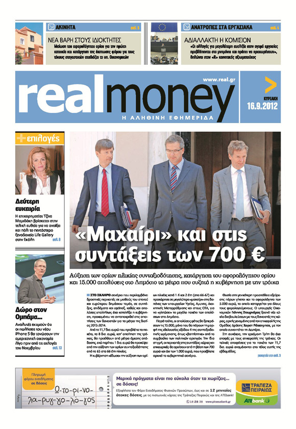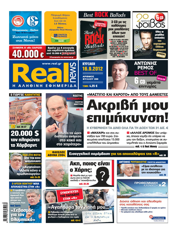 Με τίτλο: «Ακριβή μου επιμήκυνση» κυκλοφορεί σήμερα η Realnews, η οποία αποκαλύπτει το παρασκήνιο των συζητήσεων της Κυβέρνησης με τους δανειστές. Σύμφωνα με τo ρεπορτάζ που δημοσιεύει η Realnews « η κυβέρνηση τα δίνει όλα για τη δόση των 31 δισ. ευρώ» καθώς μπαίνει «μαχαίρι και στις συντάξεις των 700 ευρώ» ενώ προβλέπονται και «στοχευμένες απολύσεις 15.000 υπαλλήλων του Δημοσίου». Όπως αναφέρεται στο ρεπορτάζ: «ο Αντώνης Σαμαράς επισημαίνει σε συνομιλητές του: “άλλος δρόμος δεν υπάρχει, όποιος νομίζει ότι υπάρχει να μου τον δείξει”».Στο κύριο άρθρο της εφημερίδας και του Νίκου Χατζηνικολάου, που έχει τίτλο: «Ρήτρα… εμπιστοσύνης!» επισημαίνεται: «ας ελπίσουμε να αντιληφθούν τάχιστα οι πολιτικοί μας ότι η βασική ρήτρα που χρειάζεται σήμερα η πατρίδα είναι η ρήτρα της εμπιστοσύνης και της αξιοπιστίας».