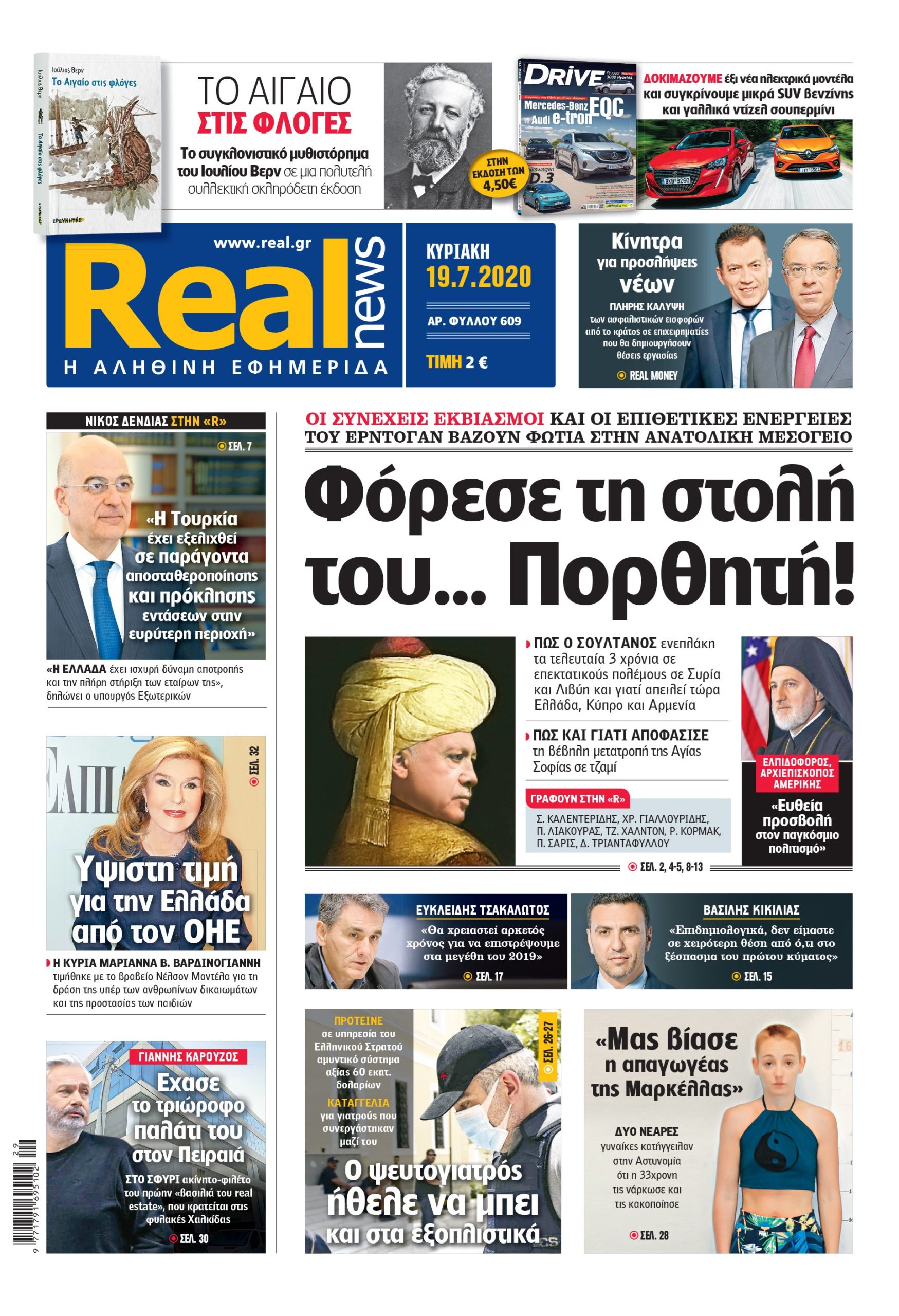 Με τίτλο: «Φόρεσε τη στολή του… Πορθητή!» κυκλοφορεί, σήμερα, η Realnews. Η εφημερίδα αναφέρει ότι οι συνεχείς εκβιασμοί και οι επιθετικές ενέργειες του Ερντογάν βάζουν φωτιά στην Ανατολική Μεσόγειο.