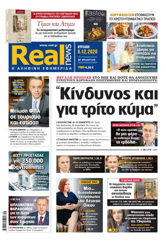 Με τίτλο: «”Κίνδυνος και για τρίτο κύμα”» κυκλοφορεί σήμερα η Realnews. Η εφημερίδα αποκαλύπτει τις προειδοποιήσεις κορυφαίων επιστημόνων και τις συστάσεις τους για μεγάλη προσοχή στο πώς και πότε θα ανοίξουμε. Στο ρεπορτάζ της εφημερίδας: