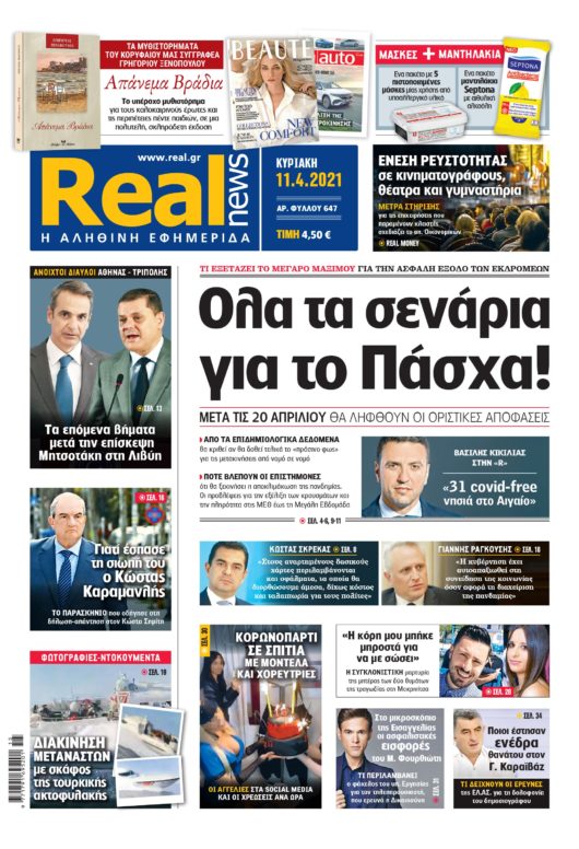 Με τίτλο: «Ολα τα σενάρια για το Πάσχα!» κυκλοφορεί σήμερα η Realnews. Η εφημερίδα αποκαλύπτει τι εξετάζει το μέγαρο Μαξίμου για την ασφαλή έξοδο των εκδρομέων.