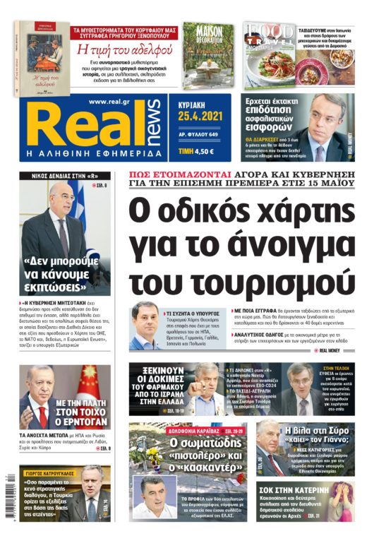 Με τίτλο: «Ο οδικός χάρτης για το άνοιγμα του τουρισμού» κυκλοφορεί σήμερα η Realnews. Η εφημερίδα αποκαλύπτει πως ετοιμάζονται αγορά και κυβέρνηση για την επίσημη πρεμιέρα στις 15 Μαΐου.