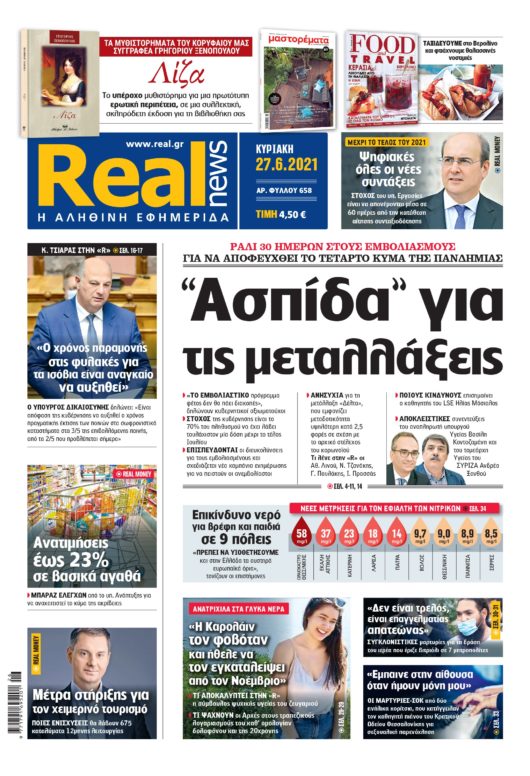 Με τίτλο: «“Ασπίδα” για τις μεταλλάξεις» κυκλοφορεί, σήμερα, η Realnews. Η εφημερίδα αποκαλύπτει ότι θα υπάρξει ράλι 30 ημέρων στους εμβολιασμούς για να αποφευχθεί το τέταρτο κύμα της πανδημίας.