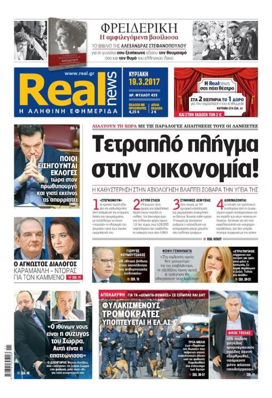 Με τίτλο: “Τετραπλό πλήγμα στην οικονομία!” κυκλοφορεί σήμερα η Realnews, η οποία επισημαίνει: “Διαλύουν τη χώρα με τις παράλογες απαιτήσεις τους οι δανειστές”.