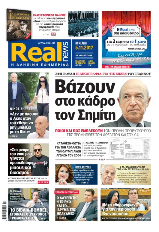 Με τίτλο: «Βάζουν στο κάδρο τον Σημίτη» κυκλοφορεί σήμερα η Realnews, η οποία αποκαλύπτει ότι εστάλη στη Βουλή η δικογραφία για τις μίζες του Γιάννου.
