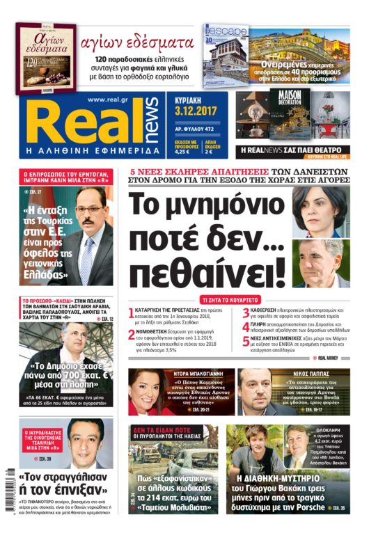 Με τίτλο: «Το μνημόνιο ποτέ δεν… πεθαίνει!», κυκλοφορεί σήμερα η Realnews.