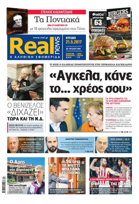 Η εφημερίδα δημοσιεύει «τα τρία σενάρια για το Eurogroup της Δευτέρας» και επισημαίνει: « «Κλειδί» για την οριστικοποίηση της συμφωνίας στην αυριανή συνεδρίαση είναι η έκθεση που θα παρουσιάσει η τρόικα για τα μέτρα που ψηφίστηκαν από το ελληνικό Κοινοβούλιο». Στο ρεπορτάζ της, η Realnews αναφέρεται και στα «εμπόδια που βάζει ο Σόιμπλε και τη γραπτή δέσμευση των υπουργών Οικονομικών της ευρωζώνης για τη ρύθμιση του ελληνικού χρέους που ζητεί ο Τόμσεν».