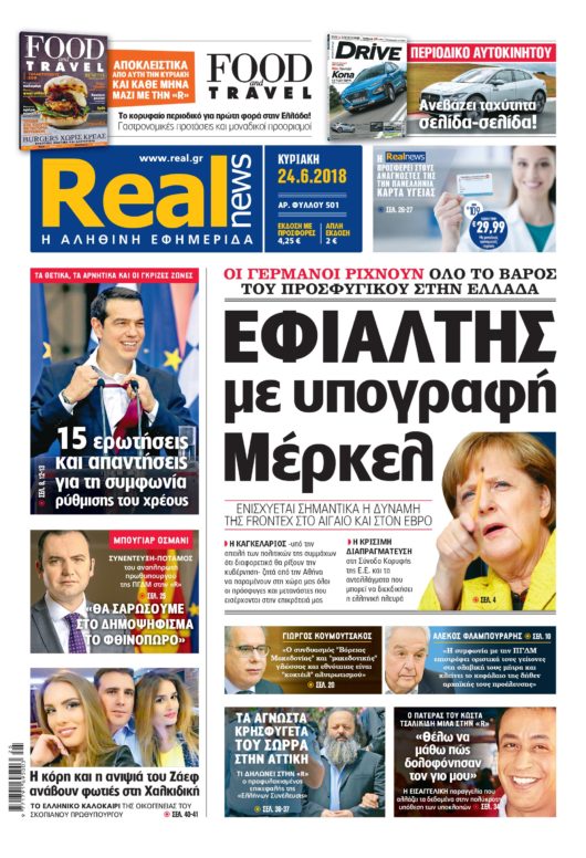 Με τίτλο: «Εφιάλτης με υπογραφή Μέρκελ», κυκλοφορεί σήμερα η Realnews.