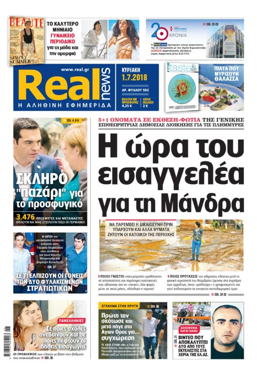 Με τίτλο: «Η ώρα του εισαγγελέα για τη Μάνδρα», κυκλοφορεί σήμερα η Realnews.