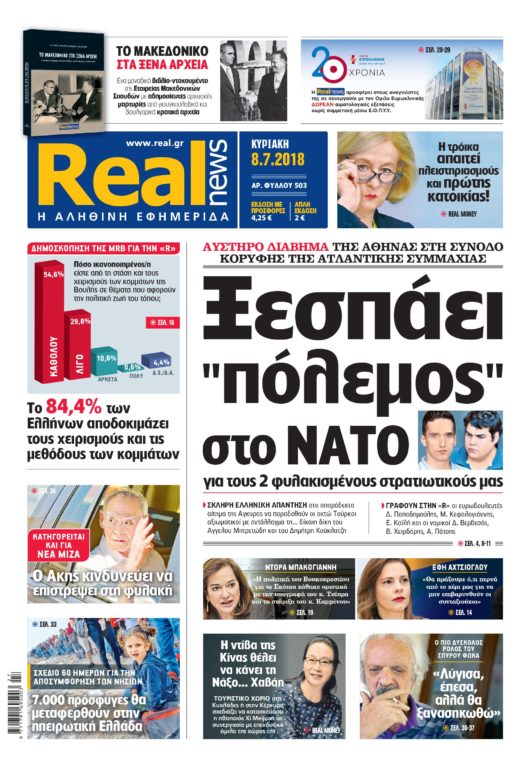 Με τίτλο: “Ξεσπάει «πόλεμος» στο ΝΑΤΟ για τους 2 φυλακισμένους στρατιωτικούς μας“, κυκλοφορεί σήμερα η Realnews.