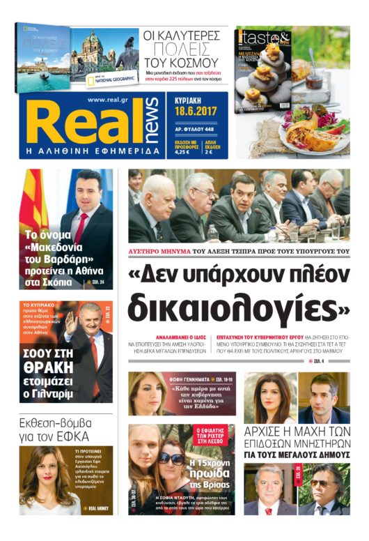 Με τίτλο: « “Δεν υπάρχουν πλέον δικαιολογίες” » κυκλοφορεί σήμερα η Realnews, η οποία αποκαλύπτει το αυστηρό μήνυμα του Αλέξη Τσίπρα προς τους υπουργούς του.