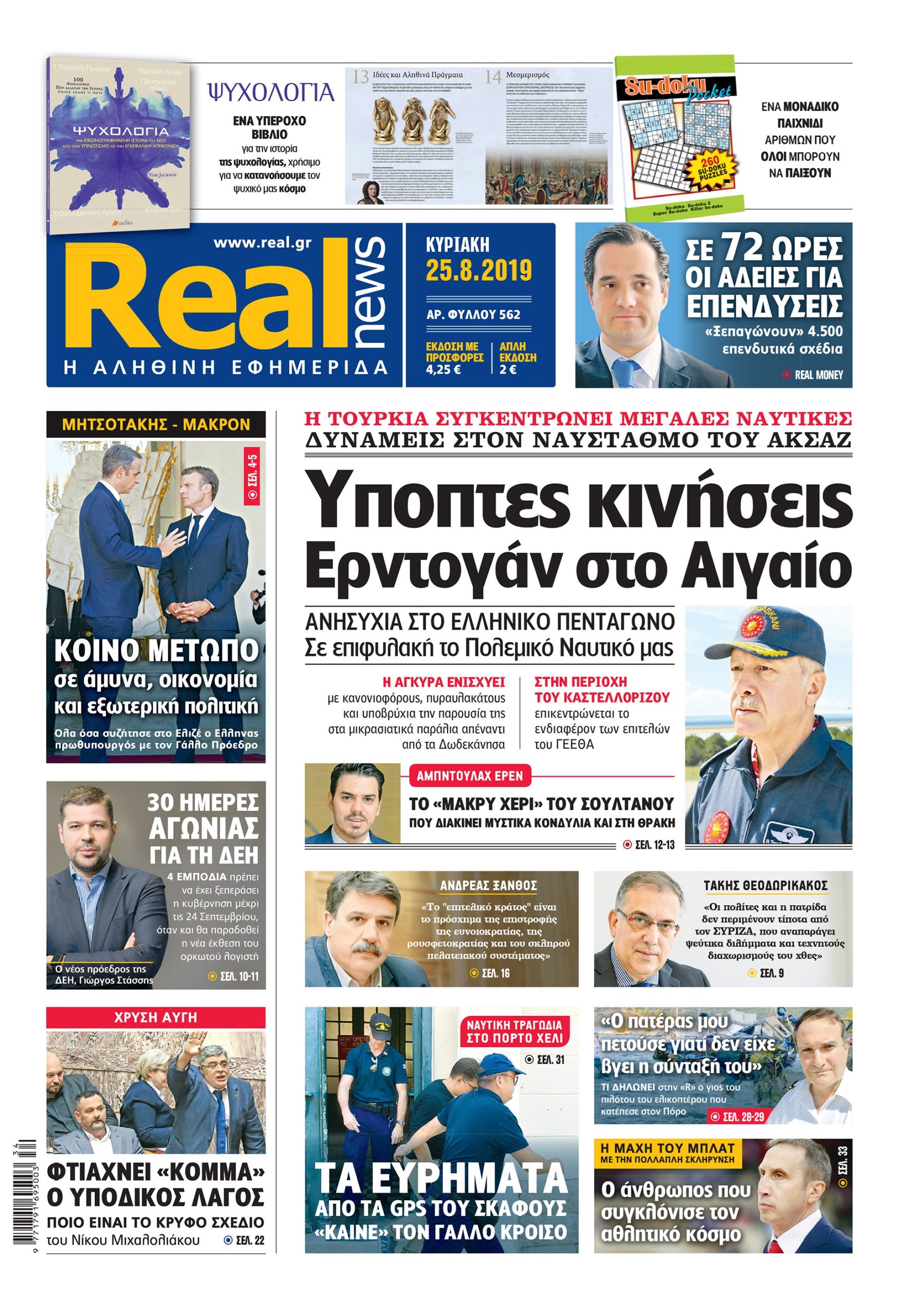Με τίτλο: «Υποπτες κινήσεις Ερντογάν στο Αιγαίο», κυκλοφορεί σήμερα η Realnews