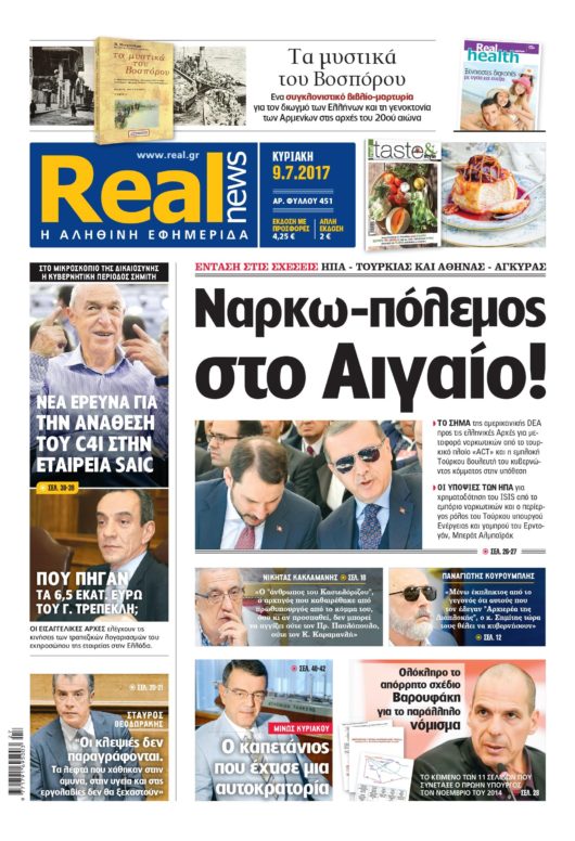 Με τίτλο: “Ναρκω-πόλεμος στο Αιγαίο!” κυκλοφορεί σήμερα η Realnews, η οποία αποκαλύπτει “την ένταση στις σχέσεις ΗΠΑ – Τουρκίας και Αθήνας – Άγκυρας”.