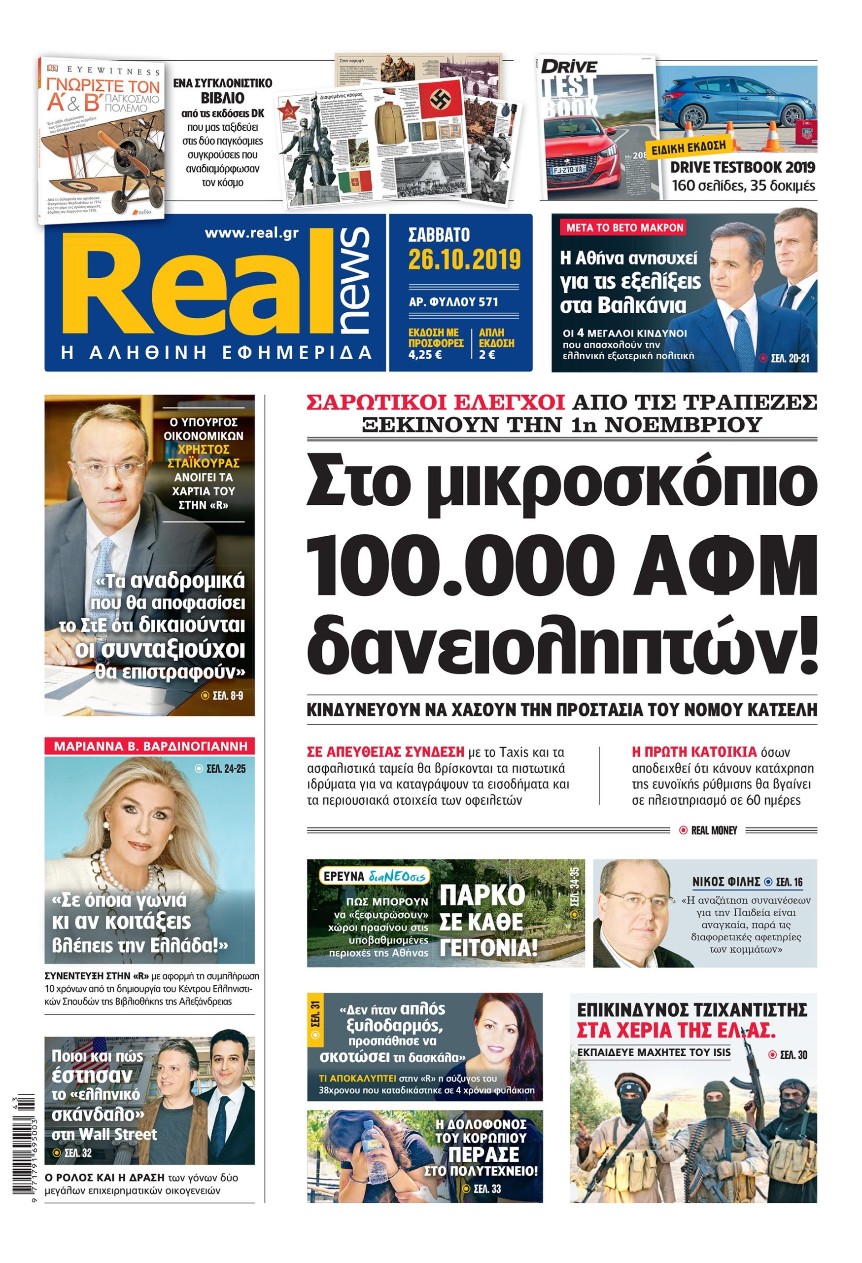 Με τίτλο: «Στο μικροσκόπιο 100.000 ΑΦΜ δανειοληπτών!», κυκλοφορεί από το Σάββατο η Realnews.
