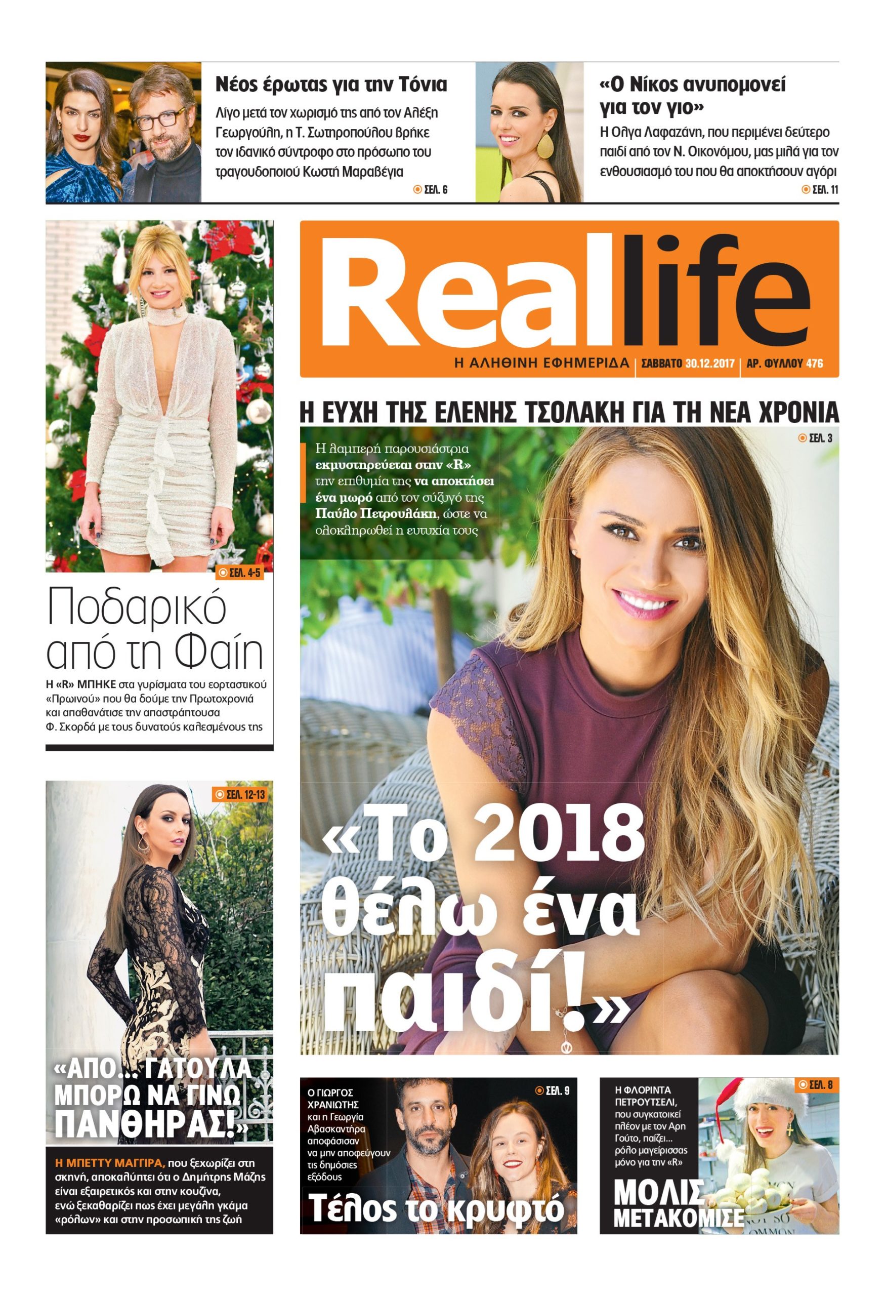 – Η ευχή της Ελένης Τσολάκη για τη νέα χρονιά: «Το 2018 θέλω ένα παιδί!». Η λαμπερή παρουσιάστρια εκμυστηρεύεται στην «R» την επιθυμία της να αποκτήσει ένα μωρό από τον σύζυγό της Παύλο Πετρουλάκη, ώστε να ολοκληρωθεί η ευτυχία τους.