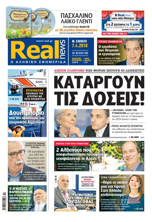 Με τίτλο: «Καταργούν τις δόσεις!» κυκλοφορεί εκτάκτως από το Μεγάλο Σάββατο η Realnews και αποκαλύπτει ότι οι δανειστές ζητούν άμεση πληρωμή των φόρων.