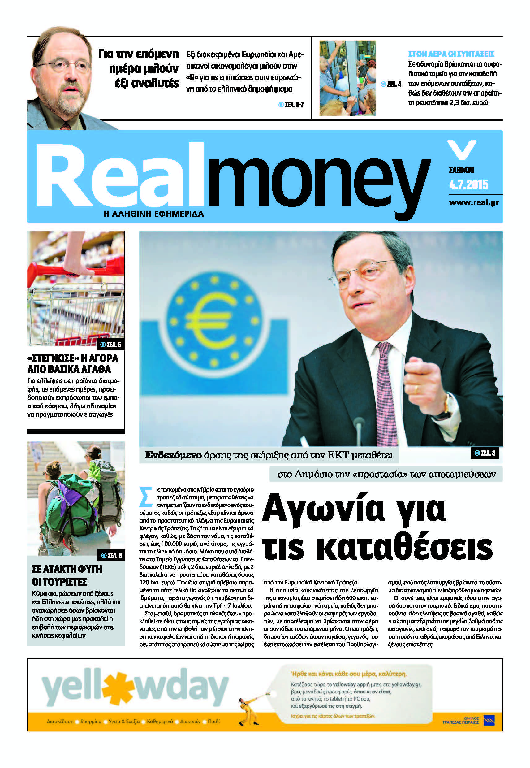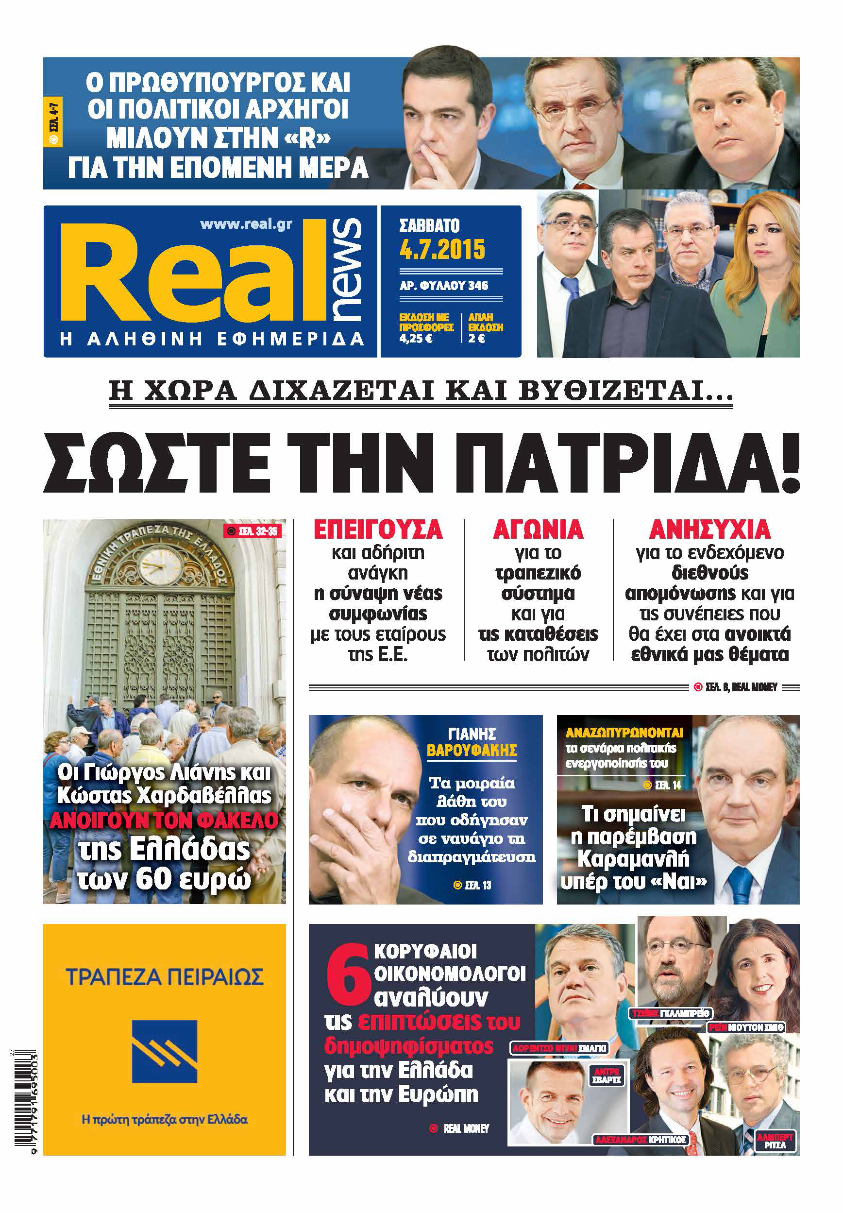 Η εφημερίδα επισημαίνει ότι “η χώρα διχάζεται και βυθίζεται” γι’ αυτό και είναι “επείγουσα και αδήριτη ανάγκη η σύναψη νέας συμφωνίας με τους εταίρους της Ε.Ε.”. Η Realnews σημειώνει ότι υπάρχει “αγωνία για το τραπεζικό σύστημα και για τις καταθέσεις των πολιτών”, αλλά και “ανησυχία για το ενδεχόμενο διεθνούς απομόνωσης και για τις συνέπειες που θα έχει στα ανοικτά εθνικά μας θέματα”.