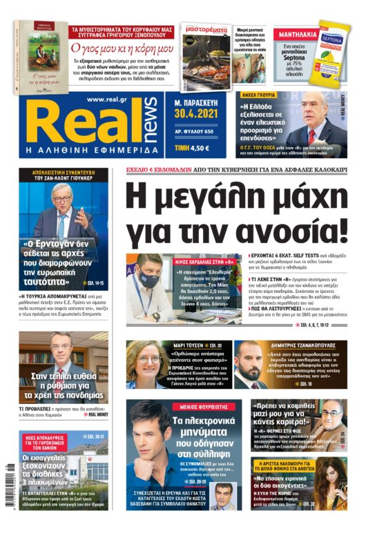 Με τίτλο: «Η μεγάλη μάχη για την ανοσία!» κυκλοφορεί, σήμερα, η Realnews. Η εφημερίδα αποκαλύπτει σχέδιο 6 εβδομάδων από την κυβέρνηση για ένα ασφαλές καλοκαίρι.