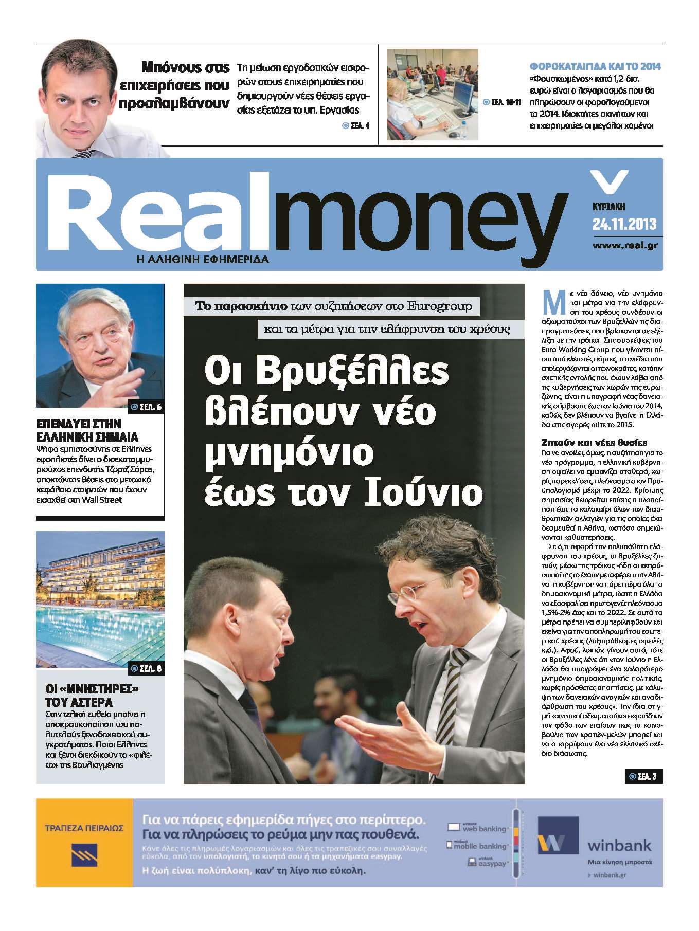 Το κύριο άρθρο της εφημερίδας και του Νίκου Χατζηνικολάου έχει τίτλο: “Ακούει κανείς;”. Ο Ν. Χατζηνικολάου γράφει: “Ολα δείχνουν -και ιδίως ο προϋπολογισμός που κατατέθηκε την Πέμπτη- ότι επιλέγεται και πάλι ο εύκολος δρόμος των εισπρακτικών μέτρων και των συνεχών και συχνά “τυφλών” περικοπών. Επιλέγονται, δηλαδή, και πάλι μέτρα που όχι μόνο δεν οδηγούν στην ανάπτυξη, αλλά, αντίθετα, βαθαίνουν την ύφεση”.