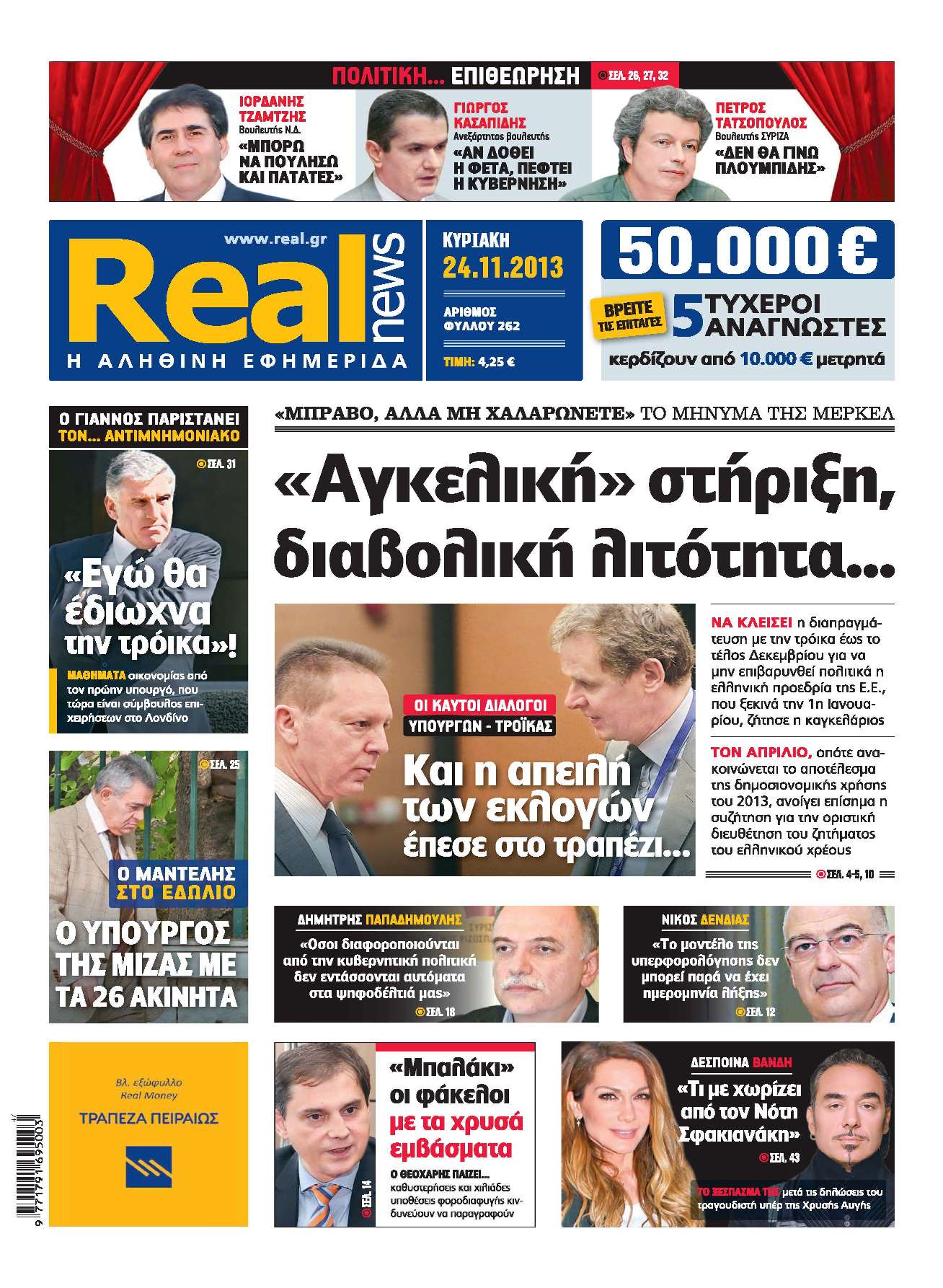 Με τίτλο: “Αγκελική” στήριξη, διαβολική λιτότητα…” κυκλοφορεί αυτήν την Κυριακή η Realnews. H εφημερίδα φωτίζει το παρασκήνιο της συνάντησης Σαμαρά-Μέρκελ και επισημαίνει το μήνυμα που έστειλε η καγκελάριος: “μπράβο, αλλά μη χαλαρώνετε”. Επίσης, όπως επισημαίνει η Realnews, η Α.Μέρκελ ζήτησε “να κλείσει η διαπραγμάτευση με την τρόικα έως το τέλος Δεκεμβρίου για να μην επιβαρυνθεί πολιτικά η ελληνική προεδρία της Ε.Ε. που ξεκινά την 1η Ιανουαρίου”. Στο ρεπορτάζ της η εφημερίδα σημειώνει ότι “τον Απρίλιο, οπότε ανακοινώνεται το αποτέλεσμα της δημοσιονομικής χρήσης του 2013, ανοίγει επίσημα η συζήτηση για την οριστική διευθέτηση του ζητήματος του ελληνικού χρέους”.