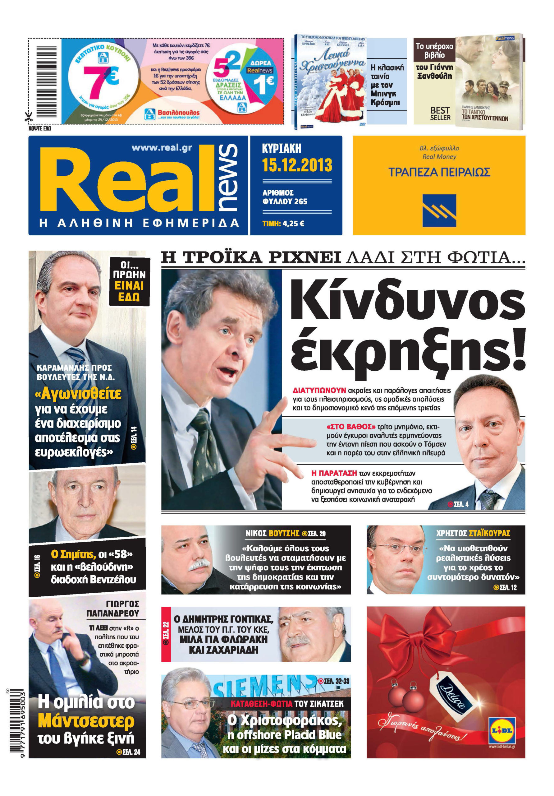 Με τίτλο: “Κίνδυνος έκρηξης!” κυκλοφορεί σήμερα η Realnews, η οποία επισημαίνει ότι “η τρόικα ρίχνει λάδι στη φωτιά”. Σύμφωνα με το ρεπορτάζ της εφημερίδας, τα μέλη της τρόικας “διατυπώνουν ακραίες και παράλογες απαιτήσεις για τους πλειστηριασμούς, τις ομαδικές απολύσεις και το δημοσιονομικό κενό της επόμενης τριετίας”. Η Realnews αναφέρεται και σε εκτιμήσεις έγκυρων αναλυτών, οι οποίοι βλέπουν “τρίτο μνημόνιο ερμηνεύοντας την έντονη πίεση που ασκούν ο Τόμσεν και η παρέα του στην ελληνική πλευρά”. Η εφημερίδα σημειώνει ότι “η παράταση των εκκρεμοτήτων αποσταθεροποιεί την κυβέρνηση και δημιουργεί ανησυχία για το ενδεχόμενο να ξεσπάσει κοινωνική αναταραχή”.