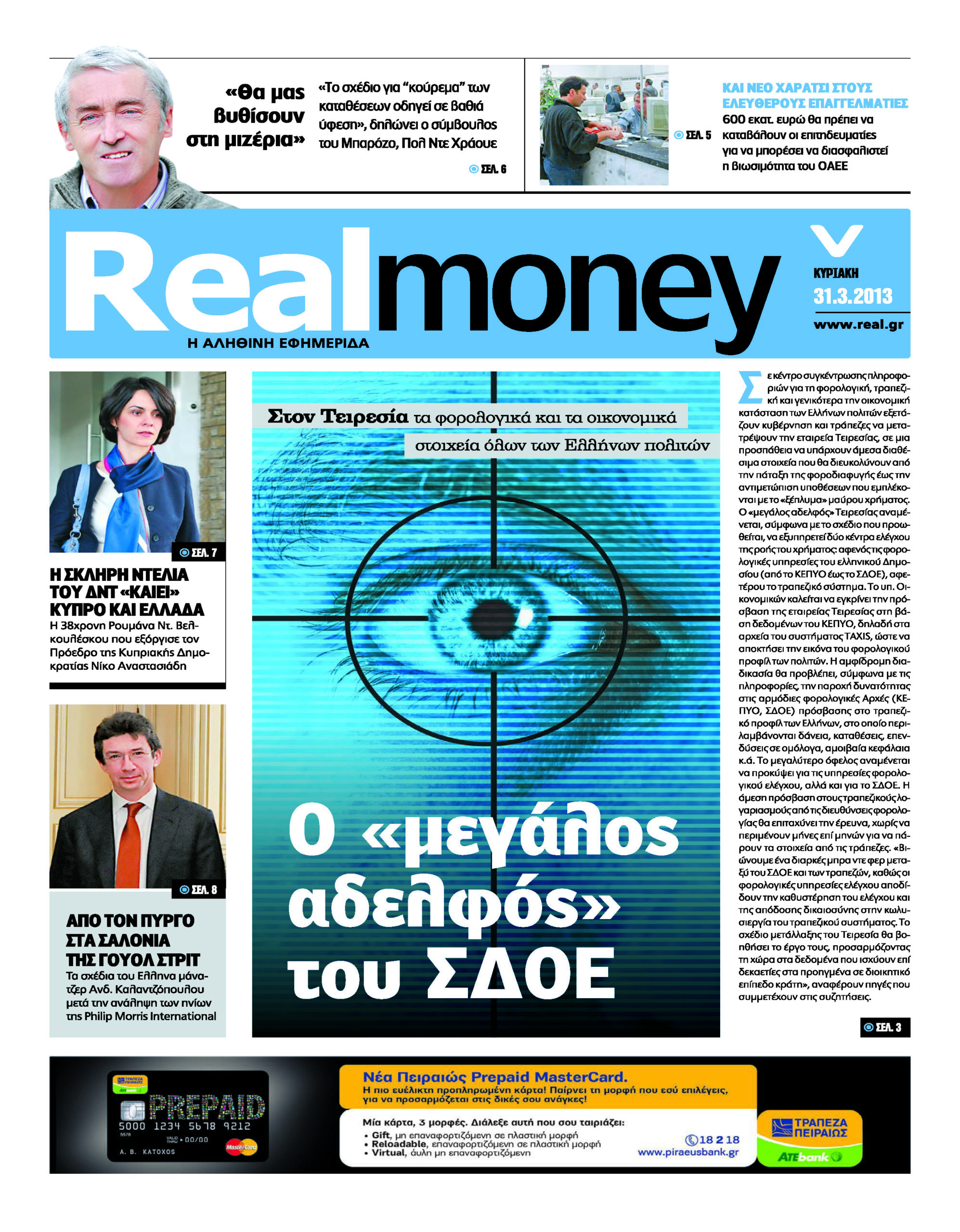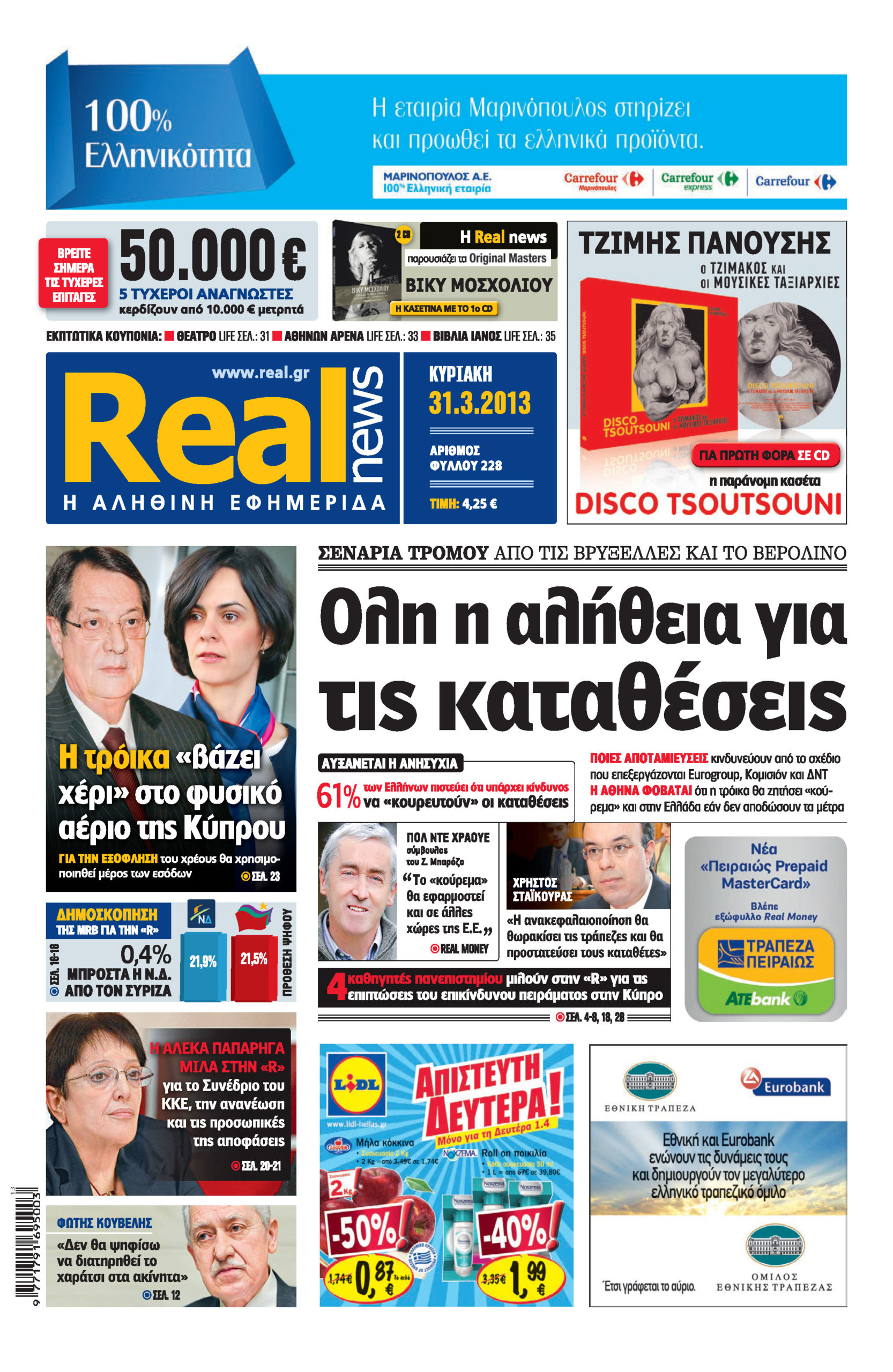 Με τίτλο: “Ολη η αλήθεια για τις καταθέσεις” κυκλοφορεί σήμερα η Realnews, η οποία αναφέρεται στα σενάρια τρόμου από τις Βρυξέλλες και το Βερολίνο. Η εφημερίδα ερευνά “ποιες αποταμιεύσεις κινδυνεύουν από το σχέδιο που επεξεργάζονται Eurogroup, Κομισιόν και ΔΝΤ”, ενώ επισημαίνει: “η Αθήνα φοβάται ότι η τρόικα θα ζητήσει “κούρεμα” και στην Ελλάδα εάν δεν αποδώσουν τα μέτρα”. Επίσης, το 61% των Ελλήνων πιστεύει ότι υπάρχει κίνδυνος να “κουρευτούν” οι καταθέσεις. Στην εφημερίδα μιλάει ο σύμβουλος του Μπαρόζο Πολ Ντε Χράουε, ο οποίος μεταξύ άλλων σημειώνει: “το «κούρεμα» θα εφαρμοστεί και σε άλλες χώρες της Ε.Ε”. Ο αναπληρωτής υπουργός Οικονομικών Χρήστος Σταικούρας σε συνεντευξή του λέει: “η ανακεφαλαιοποίηση θα θωρακίσει τις τράπεζες και θα προστατεύσει τους καταθέτες”. Ακόμη, τέσσερις καθηγητές πανεπιστημίου μιλούν στην “R” για τις επιπτώσεις του επικίνδυνου πειράματος στην Κύπρο.