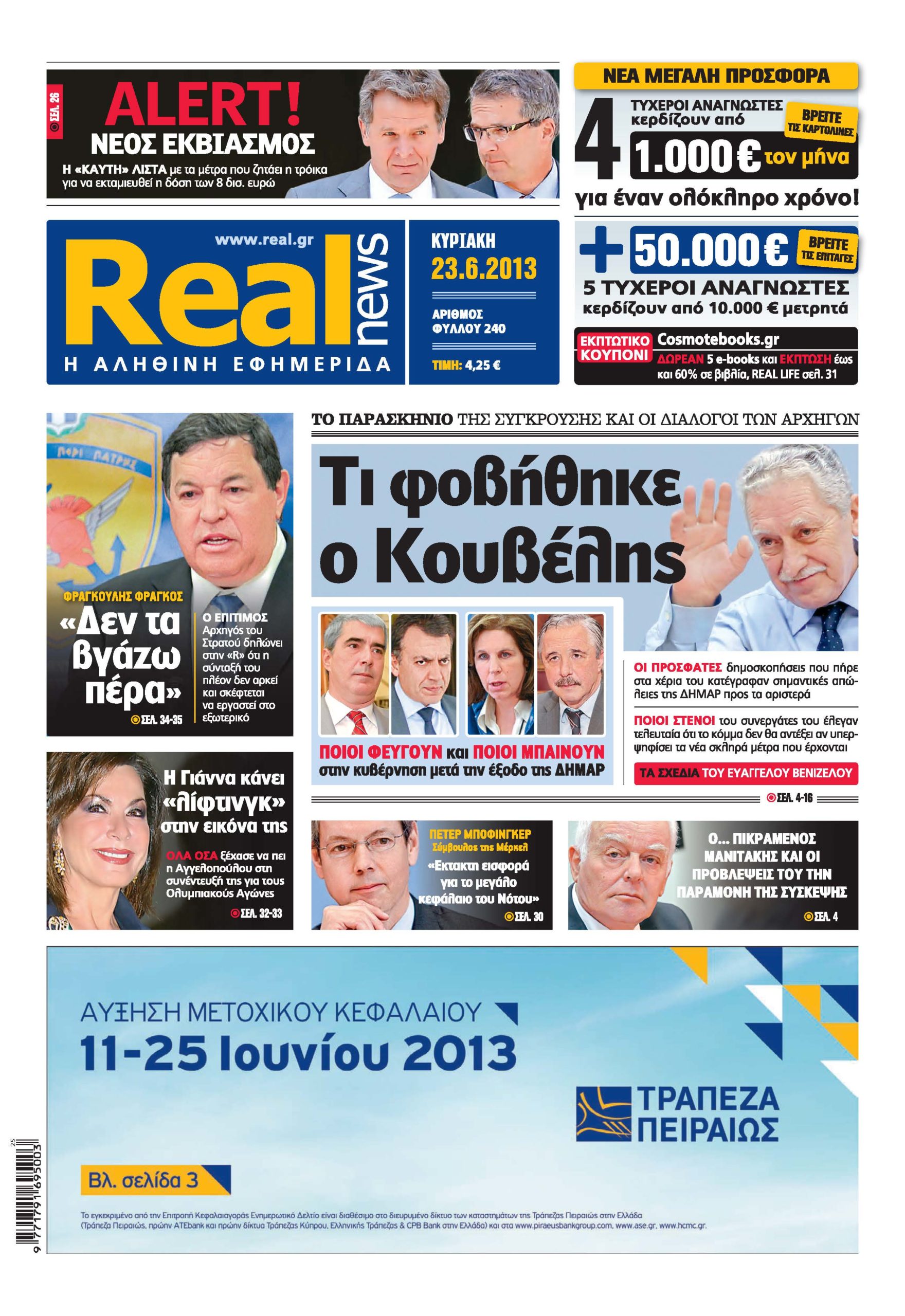 Με τίτλο: “Τι φοβήθηκε ο Κουβέλης” κυκλοφορεί σήμερα η Realnews, η οποία αποκαλύπτει το παρασκήνιο της σύγκρουσης και τους διαλόγους των πολιτικών αρχηγών. Σύμφωνα με το ρεπορτάζ της εφημερίδας “οι πρόσφατες δημοσκοπήσεις που πήρε στα χέρια του ο Φώτης Κουβέλης κατέγραφαν σημαντικές απώλειες της ΔΗΜΑΡ προς τα αριστερά”, ενώ αναφέρεται και σε “στενούς συνεργάτες του που του έλεγαν τελευταία ότι το κόμμα δεν θα αντέξει αν υπερψηφίσει τα νέα σκληρά μέτρα που έρχονται”. Το πολυσέλιδο ρεπορτάζ της εφημερίδας για όσα συμβαίνουν στην Κυβέρνηση, ολοκληρώνεται με πληροφορίες για τα σχέδια του Ευάγγελου Βενιζέλου, αλλά και για το ποιοι φεύγουν και ποιοι μπαίνουν στην Κυβέρνηση μετά την έξοδο της ΔΗΜΑΡ.