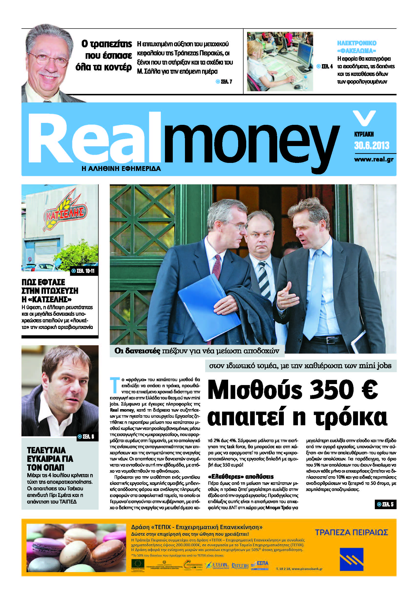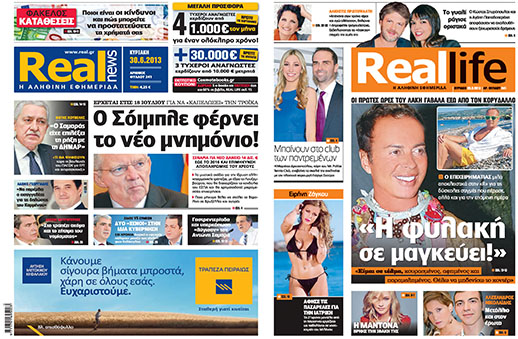 Με τίτλο: “Ο Σόιμπλε φέρνει το νέο μνημόνιο!” κυκλοφορεί σήμερα η Realnews, η οποία αποκαλύπτει ότι ο Γερμανός υπουργός Οικονομικών έρχεται στις 18 Ιουλίου για να “καπελώσει” την τρόικα! Στις αποσκευές του θα έχει “σενάρια για νέο δάνειο 14 δισ. ευρώ έως το 2016 και επιμήκυνση αποπληρωμής του χρέους”. Η εφημερίδα δημοσιεύει ρεπορτάζ για “το μυστικό σχέδιο για την ίδρυση ελληνογερμανικής τράπεζας, με έδρα το Λουξεμβούργο, που θα διαχειρίζεται τα κονδύλια του ΕΣΠΑ και θα χρηματοδοτεί μικρομεσαίες επιχειρήσεις”.