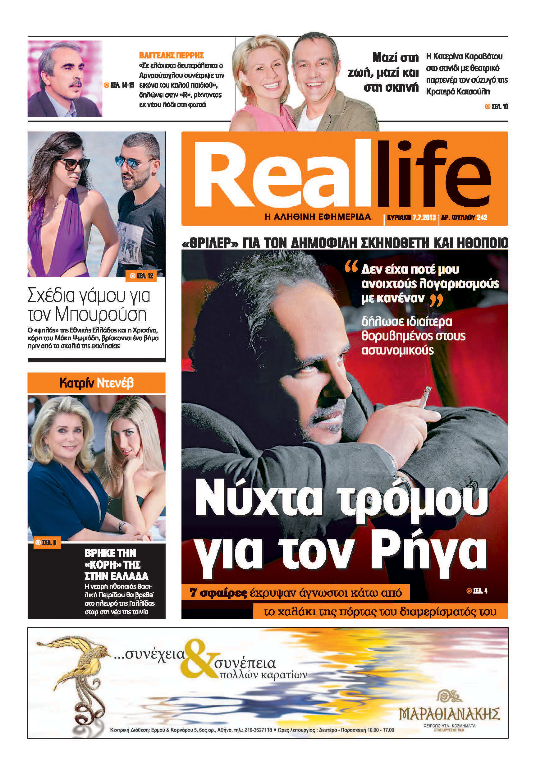 – Νύχτα τρόμου για τον Ρήγα. Επτά σφαίρες έκρυψαν άγνωστοι κάτω από το χαλάκι της πόρτας του διαμερίσματός του. “Θρίλερ” για τον δημοφιλή σκηνοθέτη και ηθοποιό. “Δεν είχα ποτέ μου ανοιχτούς λογαριασμούς με κανέναν” δήλωσε ιδιαίτερα θορυβημένος στους αστυνομικούς.