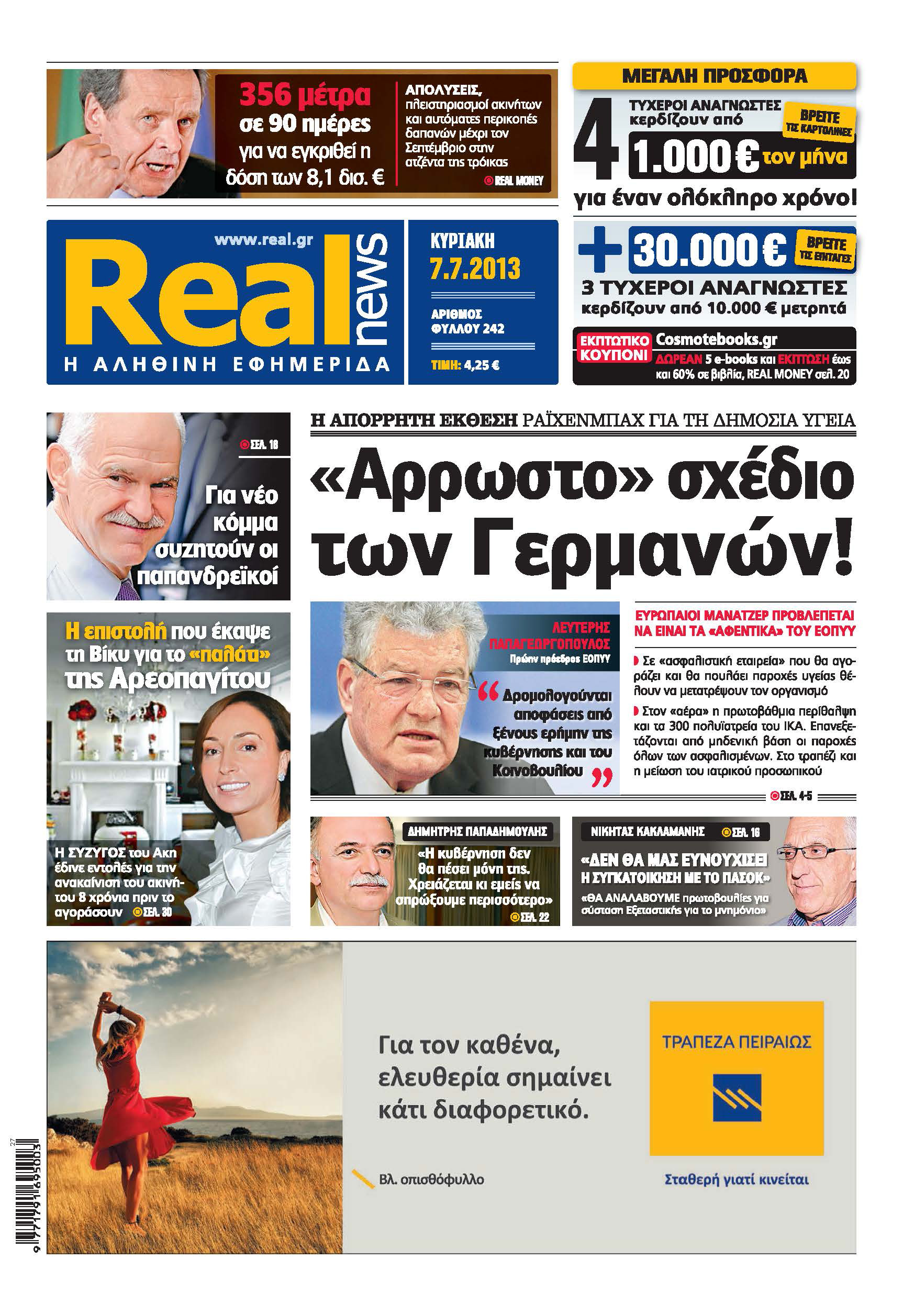 Με τίτλο: “Αρρωστο” σχέδιο των Γερμανών! κυκλοφορεί σήμερα η Realnews, η οποία αποκαλύπτει την απόρρητη έκθεση Ράϊχενμπαχ για τη δημόσια υγεία. Σύμφωνα με το ρεπορτάζ της εφημερίδας “ευρωπαίοι μάνατζερ προβλέπεται να είναι τα “αφεντικά” του ΕΟΠΥΥ”. Όπως επισημαίνει η Realnews «σε “ασφαλιστική εταιρεία” που θα αγοράζει και θα πουλάει παροχές υγείας θέλουν να μετατρέψουν τον οργανισμό», ενώ «στον “αέρα” είναι η πρωτοβάθμια περίθαλψη και τα 300 πολυϊατρεία του ΙΚΑ». Επίσης, «επανεξετάζονται από μηδενική βάση οι παροχές όλων των ασφαλισμένων, ενώ στο τραπέζι μπαίνει και η μείωση του ιατρικού προσωπικού». Ο πρώην πρόεδρος του ΕΟΠΥΥ Λευτέρης Παπαγεωργόπουλος επισημαίνει: «δρομολογούνται αποφάσεις από ξένους ερήμην της κυβέρνησης και του Κοινοβουλίου».