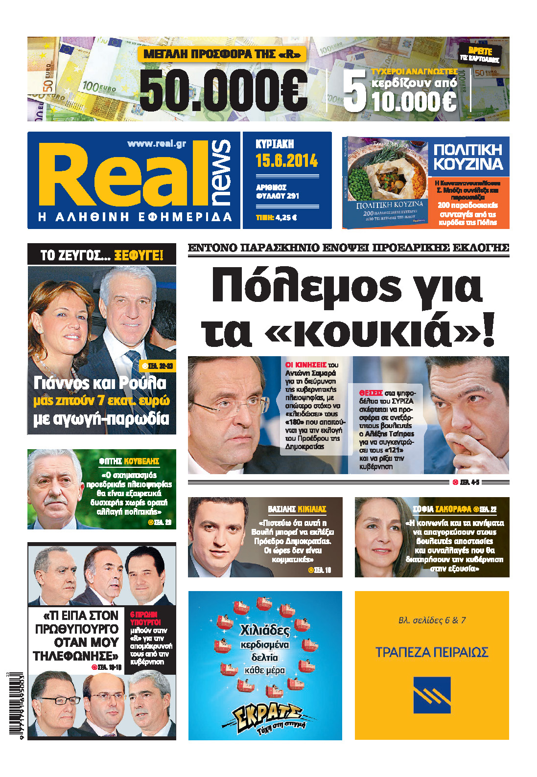Με τίτλο: “Πόλεμος για τα “κουκιά”!” κυκλοφορεί σήμερα η Realnews, η οποία αναφέρεται στο έντονο παρασκήνιο ενόψει προεδρικής εκλογής. Το ρεπορτάζ της εφημερίδας καταγράφει τις “κινήσεις του Αντώνη Σαμαρά για τη διεύρυνση της κυβερνητικής πλειοψηφίας, με απώτερο στόχο να “κλειδώσει” τους “180” που απαιτούνται για την εκλογή του Προέδρου της Δημοκρατίας”. Την ίδια ώρα, “θέσεις στα ψηφοδέλτια του ΣΥΡΙΖΑ σκέφτεται να προσφέρει σε ανεξάρτητους βουλευτές ο Αλέξης Τσίπρας για να συγκεντρώσει τους “121” και να ρίξει την κυβέρνηση”.