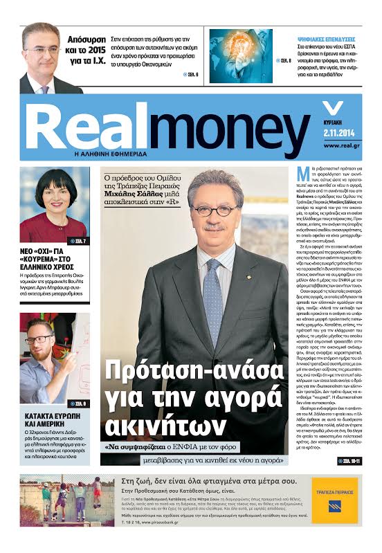 – Μιχάλης Σάλλας, πρόεδρος του Ομίλου της Τράπεζας Πειραιώς: “Χρειαζόμαστε εθνικό σχέδιο ανασυγκρότησης”. Πρόταση-βόμβα για τον ΕΝΦΙΑ: “Να παρασχεθεί η δυνατότητα στους κατόχους ακινήτων να συμψηφίσουν όλον ή μέρος του ΕΝΦΙΑ με τον φόρο μεταβίβασης”.