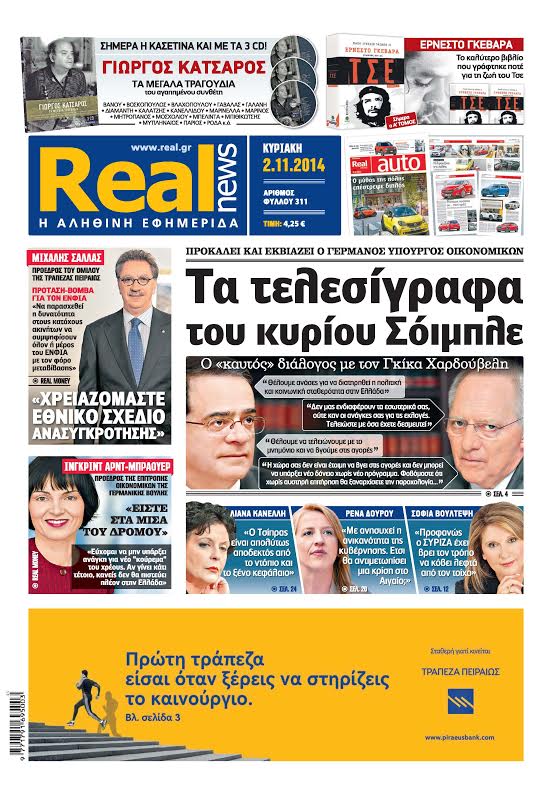 Με τίτλο: “Τα τελεσίγραφα του κυρίου Σόιμπλε” κυκλοφορεί σήμερα η Realnews, η οποία σημειώνει ότι “προκαλεί και εκβιάζει ο Γερμανός υπουργός Οικονομικών”. Η εφημερίδα αποκαλύπτει τον “καυτό” διάλογο του κ. Σόιμπλε με τον Έλληνα ομόλογό του Γκίκα Χαρδούβελη. Σύμφωνα με το ρεπορτάζ της εφημερίδας ο Ελληνας υπουργός Οικονομικών είπε: “Θέλουμε ανάσες για να διατηρηθεί η πολιτική και κοινωνική σταθερότητα στην Ελλάδα” για να απαντήσει ο Γερμανός συνάδελφός του: “Δεν μας ενδιαφέρουν τα εσωτερικά σας, ούτε καν οι ανάγκες σας για τις εκλογές. Τελειώστε με όσα έχετε δεσμευτεί”.