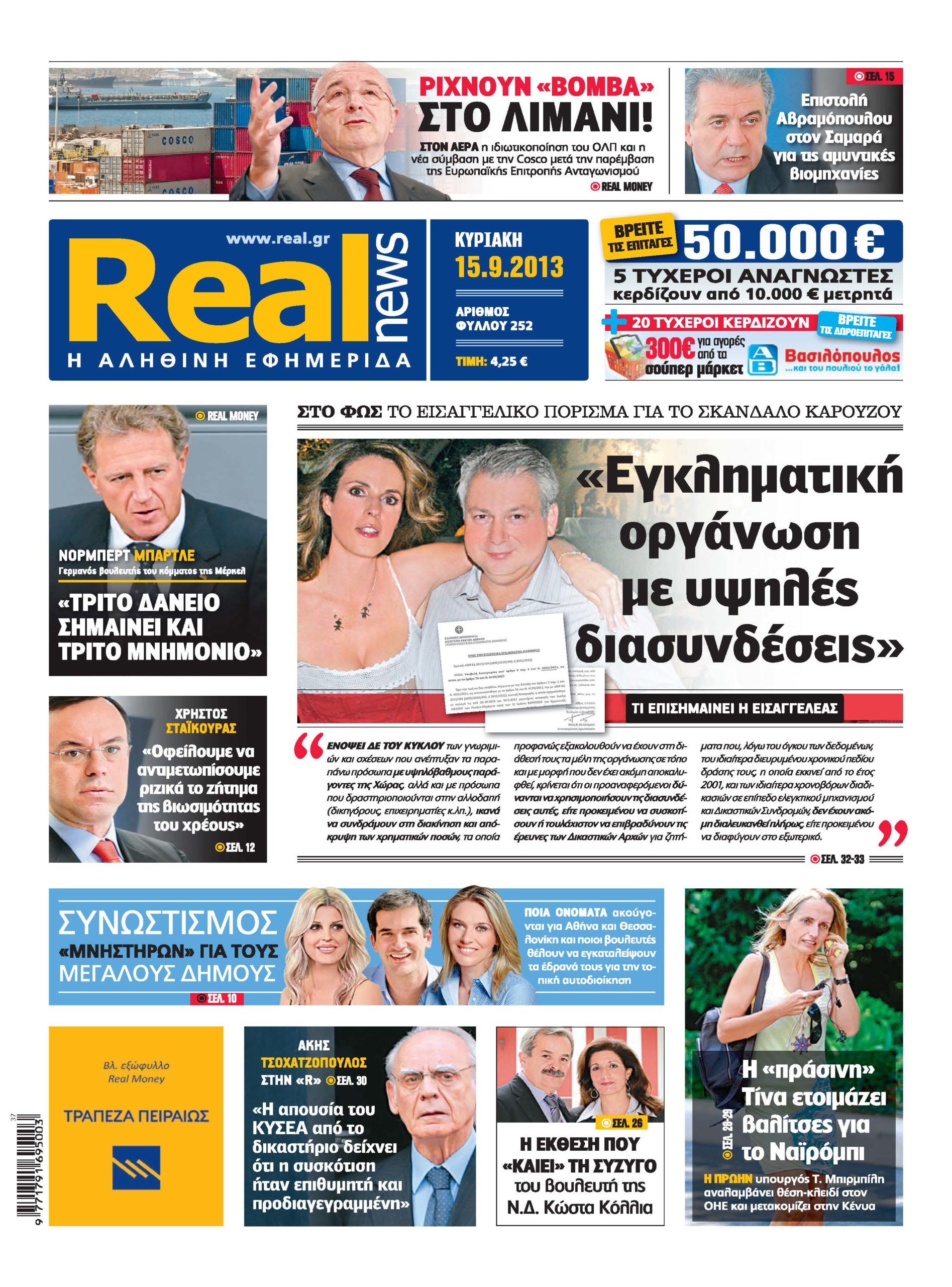 Με τίτλο: “Εγκληματική οργάνωση με υψηλές διασυνδέσεις” κυκλοφορεί σήμερα η Realnews, η οποία φέρνει στο φως το εισαγγελικό πόρισμα για το σκάνδαλο Καρούζου. Σύμφωνα με το ρεπορτάζ της εφημερίδας, στο πόρισμα της, η εισαγγελέας αναφέρεται στον Γ. Καρούζο, την Ρ. Σκαφτούρα καθώς και σε άλλα πρόσωπα που φέρονται να εμπλέκονται στο σκάνδαλο επισημαίνοντας:“ΕΝΟΨΕΙ ΔΕ ΤΟΥ ΚΥΚΛΟΥ των γνωριμιών και σχέσεων που ανέπτυξαν τα παραπάνω πρόσωπα με υψηλόβαθμους παράγοντες της Χώρας, αλλά και με πρόσωπα που δραστηριοποιούνται στην αλλοδαπή (δικηγόρους, επιχειρηματίες κ.λπ.), ικανά να συνδράμουν στη διακίνηση και απόκρυψη των χρηματικών ποσών, τα οποία προφανώς εξακολουθούν να έχουν στη διάθεσή τους τα μέλη της οργάνωσης σε τόπο και με μορφή που δεν έχει ακόμη αποκαλυφθεί, κρίνεται ότι οι προαναφερόμενοι δύναται να χρησιμοποιήσουν τις διασυνδέσεις, είτε προκειμένου να συσκοτίσουν ή τουλάχιστον να επιβραδύνουν τις έρευνες των Δικαστικών Αρχών για ζητήματα που, λόγω του όγκου των δεδομένων, του ιδιαίτερα διευρυμένου χρονικού πεδίου δράσης τους, η οποία εκκινεί από το έτος 2001, και των ιδιαίτερα χρονοβόρων διαδικασιών σε επίπεδο ελεγκτικού μηχανισμού και Δικαστικών Συνδρομών δεν έχουν ακόμη διαλευκανθεί πλήρως, είτε προκειμένου να διαφύγουν στο εξωτερικό”.