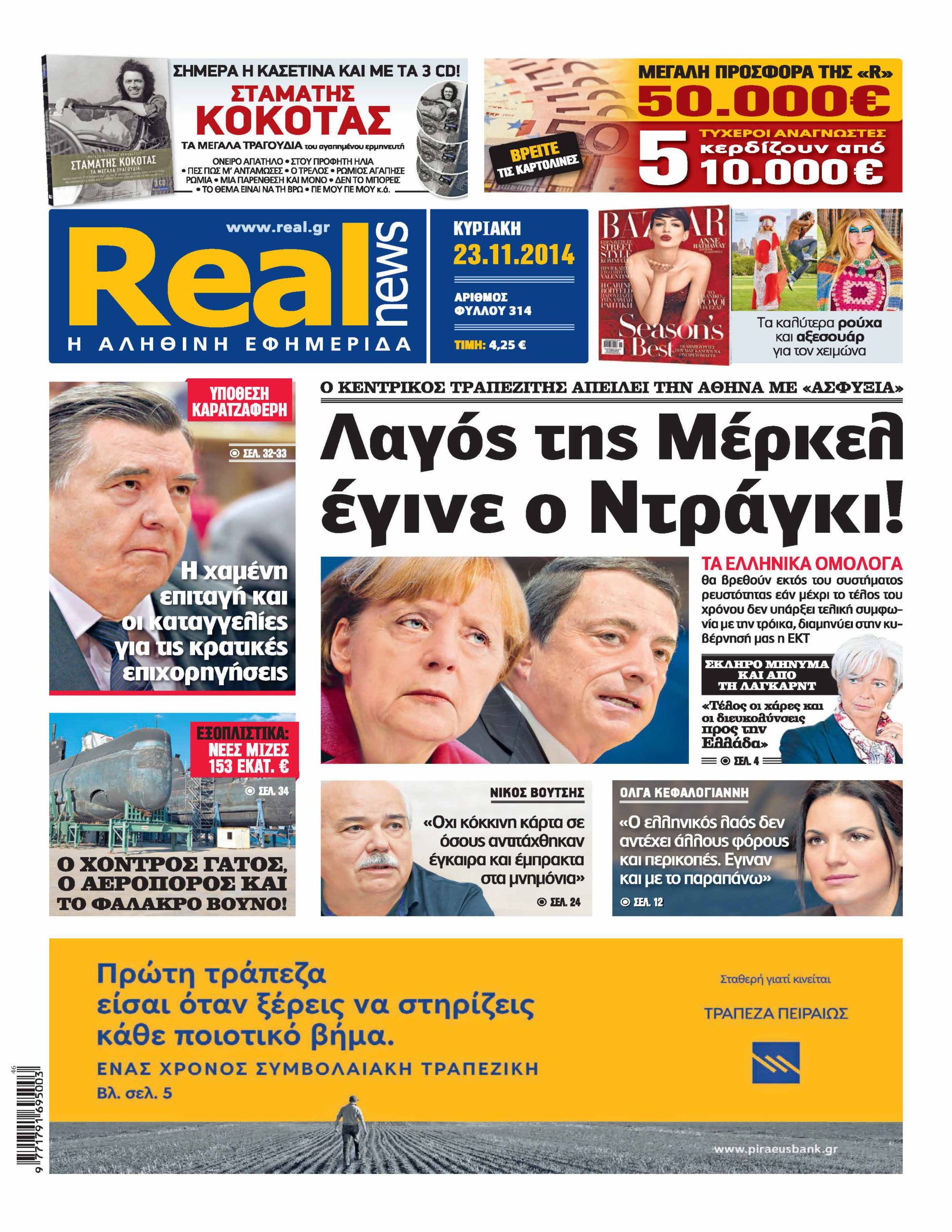 Με τίτλο: “Λαγός της Μέρκελ έγινε ο Ντράγκι”κυκλοφορεί σήμερα η Realnews, η οποία αποκαλύπτει ότι “ο κεντρικός τραπεζίτης απειλεί την Αθήνα με “ασφυξία” “. Στο ρεπορτάζ της, η εφημερίδα επισημαίνει: “τα ελληνικά ομόλογα θα βρεθούν εκτός του συστήματος ρευστότητας εάν μέχρι το τέλος του χρόνου δεν υπάρξει τελική συμφωνία με την τρόικα, διαμηνύει στην κυβέρνησή μας η ΕΚΤ”. Επίσης η Realnews αναφέρεται στο σκληρό μήνυμα που έστειλε η Λαγκάρντ: “Τέλος οι χάρες και οι διευκολύνσεις προς την Ελλάδα”.