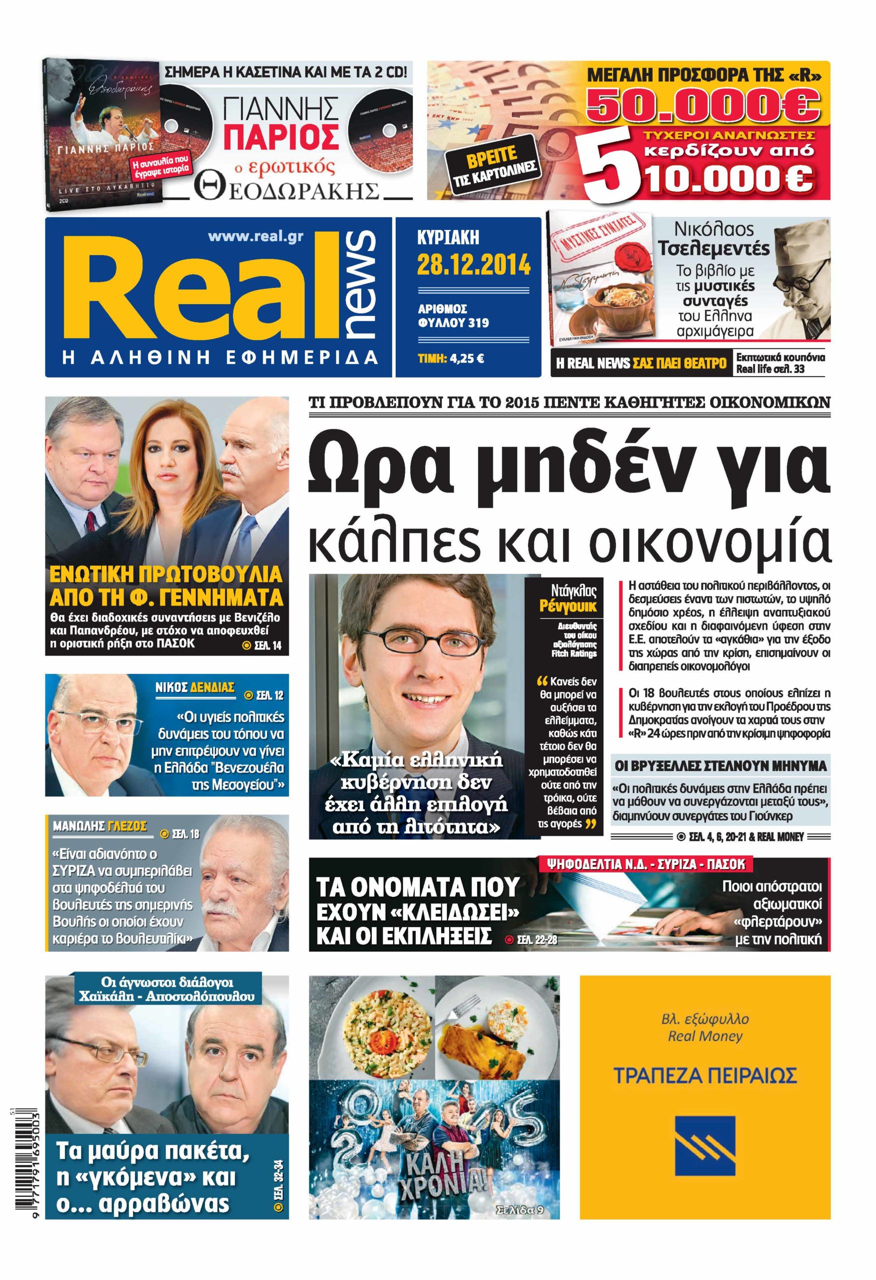 Με τίτλο: “Ωρα μηδέν για κάλπες και οικονομία” κυκλοφορεί σήμερα η Realnews, η οποία φιλοξενεί τις προβλέψεις για το 2015 πέντε καθηγητών Οικονομικών.