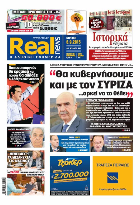 Με τίτλο: “Θα κυβερνήσουμε και με τον ΣΥΡΙΖΑ… αρκεί να το θέλει” κυκλοφορεί σήμερα η Realnews, η οποία δημοσιεύει “αποκαλυπτική συνέντευξη του Ευ. Μεϊμαράκη”.