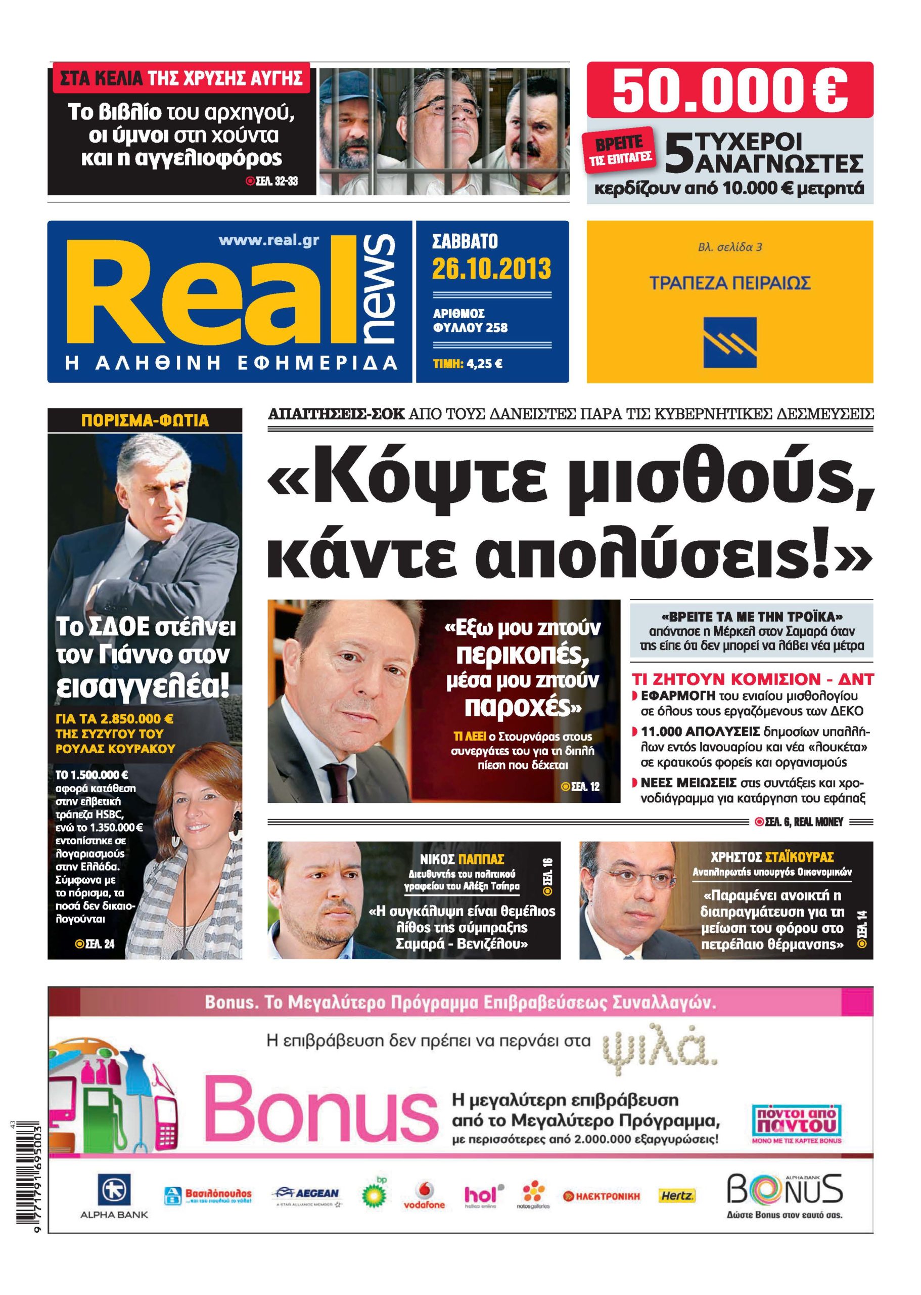 Με τίτλο: “Κόψτε μισθούς, κάντε απολύσεις!” κυκλοφορεί σήμερα η Realnews. Η εφημερίδα αποκαλύπτει τις απαιτήσεις-σοκ που προβάλλουν οι δανειστές, παρά τις κυβερνητικές δεσμεύσεις.