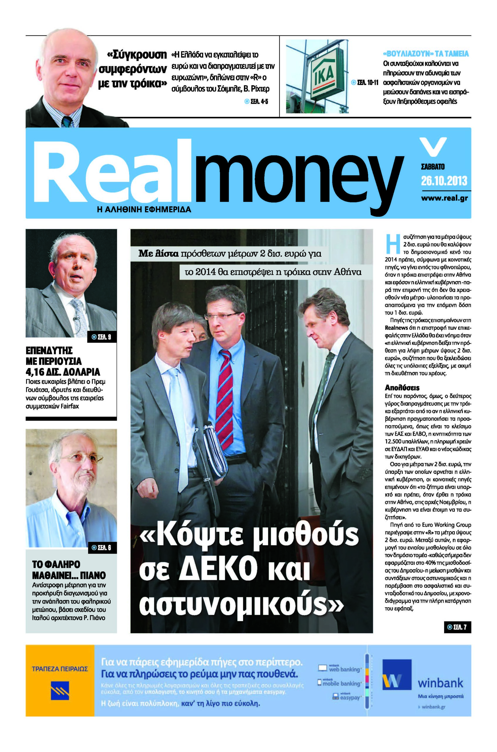 Το κύριο άρθρο της εφημερίδας και του Νίκου Χατζηνικολάου έχει τίτλο: “Το “ΟΧΙ” στην τρόικα δεν αρκεί…”. Ο Ν. Χατζηνικολάου επισημαίνει χαρακτηριστικά: “Αν αύριο απαντήσουν οι δανειστές ότι δέχονται τελικά όλους τους “όρους” της ελληνικής κυβέρνησης για τον προϋπολογισμό του 2014, είμαστε έτοιμοι να ξεκινήσουμε την πορεία του… θριάμβου; Η χώρα θα βαδίσει στη λεωφόρο της ανάπτυξης και της προόδου; Η οικονομία θα ανακάμψει και η κοινωνία θα αναπνεύσει; Η απάντηση στο ερώτημα αυτό οδηγεί στη διάγνωση του πραγματικού προβλήματος…”.