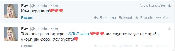 Η Φαίη Σκορδά καλημέρισε τους φίλους της στο twitter και τους ενημέρωσε ότι σήμερα είναι η τελευταία εκπομπή του “Πρωινό” για την φετινή τηλεοπτική σεζόν.