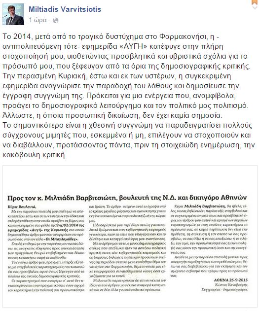 Συγγνώμη από τον βουλευτή της ΝΔ και πρώην υπουργό Ναυτιλίας Μιλτιάδη Βαρβιτσιώτη ζητά δημοσιογράφος της εφημερίδας “Αυγή” με αφορμή ένα άρθρο που είχε δημοσιεύσει τον Φεβρουάριο του 2014 για το τραγικό δυστύχημα στο Φαρμακονήσι.