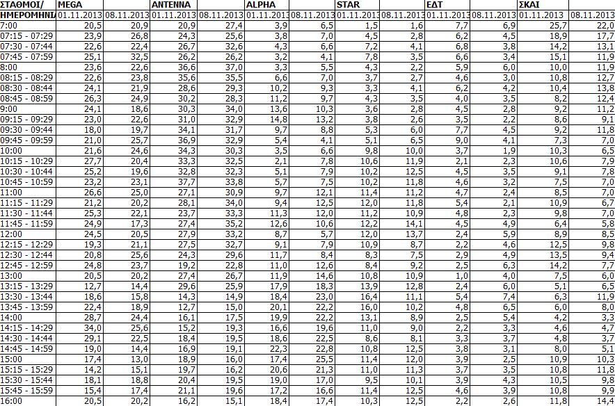 Δείτε τις μετρήσεις τηλεθέασης για την Παρασκευή (8/11) των τηλεοπτικών σταθμών εθνικής εμβέλειας.