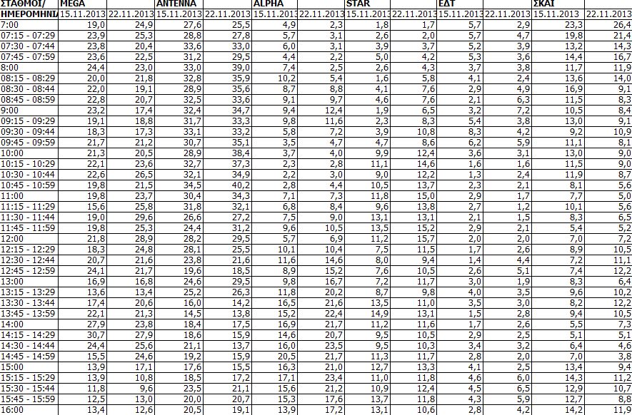 Δείτε τις μετρήσεις τηλεθέασης για την Παρασκευή (22/11) των τηλεοπτικών σταθμών εθνικής εμβέλειας.