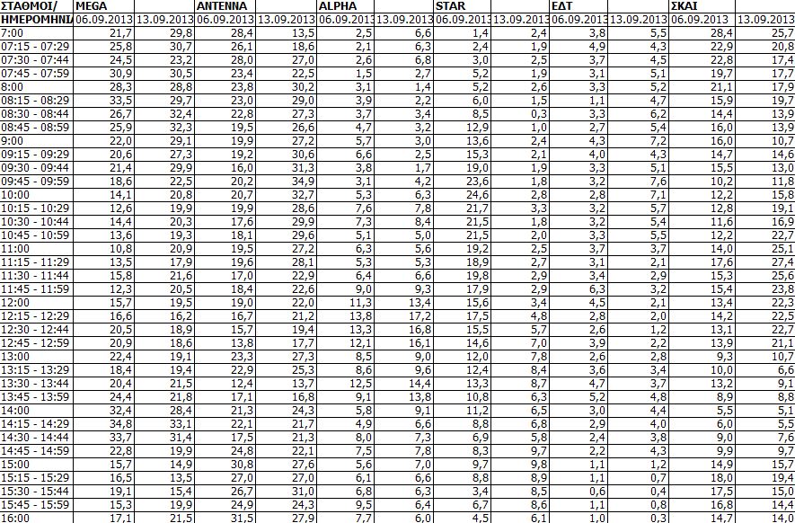 Δείτε τις μετρήσεις τηλεθέασης για την Παρασκευή (13/9) των τηλεοπτικών σταθμών εθνικής εμβέλειας.