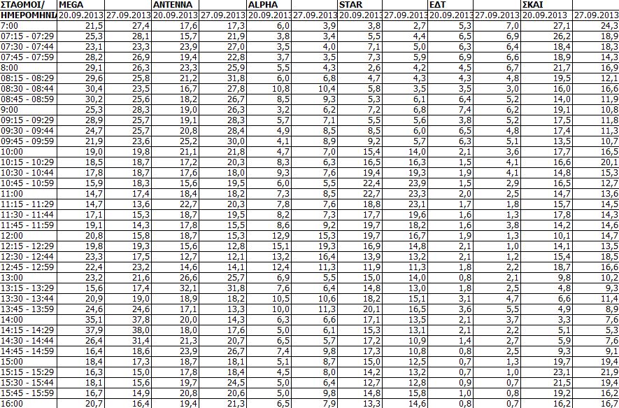 Δείτε τις μετρήσεις τηλεθέασης για την Παρασκευή (27/9) των τηλεοπτικών σταθμών εθνικής εμβέλειας.