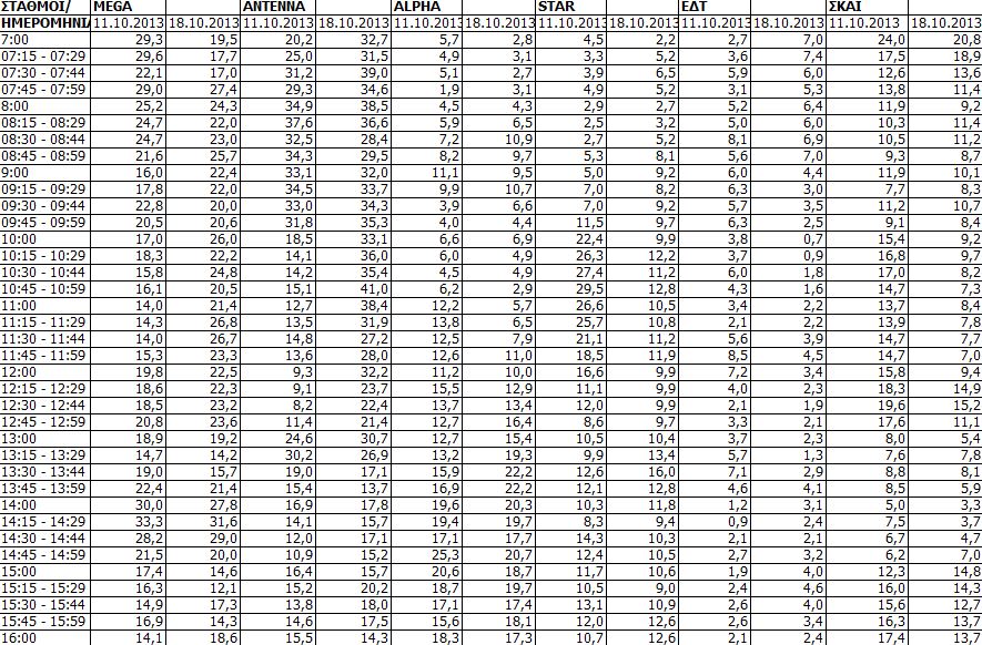 Δείτε τις μετρήσεις τηλεθέασης για την Παρασκευή (18/10) των τηλεοπτικών σταθμών εθνικής εμβέλειας.