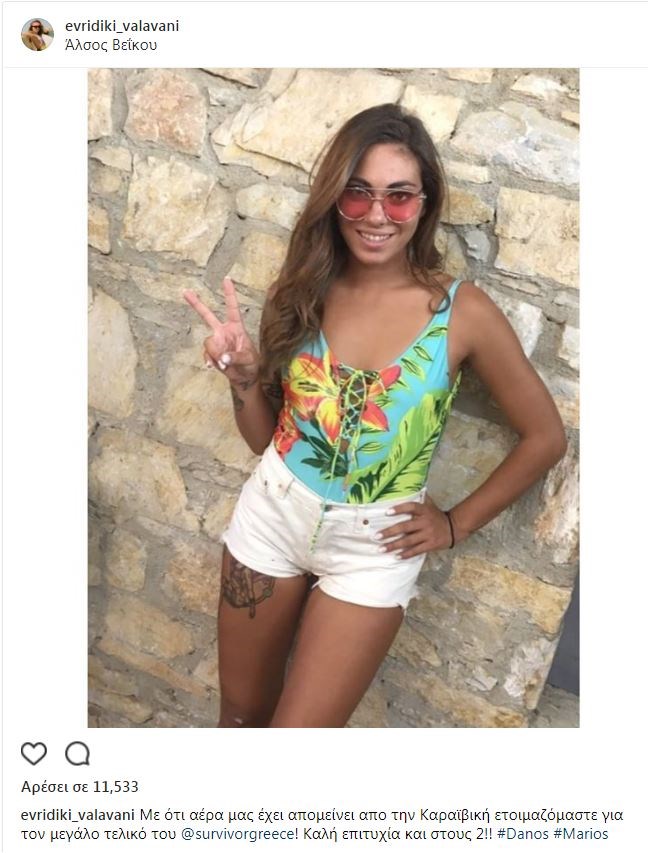 «Με ότι αέρα μας έχει απομείνει από την Καραϊβική ετοιμαζόμαστε για τον μεγάλο τελικό του @survivorgreece! Καλή επιτυχία και στους 2!! #Danos #Marios», ήταν η λεζάντα που συνόδευε την ανάρτηση της δημοσιογράφου.