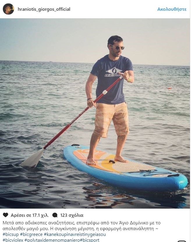 «Μετά από αδιάκοπες αναζητήσεις, επιστρέφω από τον Άγιο Δομίνικο με το απολεσθέν μαγιό μου. Η συγκίνηση μέγιστη, η εφαρμογή ανεπανάληπτη» έγραψε χαρακτηριστικά ο Χρανιώτης και ανήρτησε μία φωτογραφία, όπου κάνει κουπί.