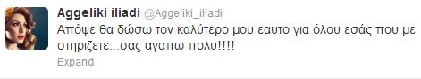 Λίγο πριν ανέβει στη σκηνή και λικνιστεί στο ρυθμό του τραγουδιού “1000 και μία νύχτες” η Αγγελική Ηλιάδη έδωσε μια υπόσχεση στους θαυμαστές της μέσω twitter:
