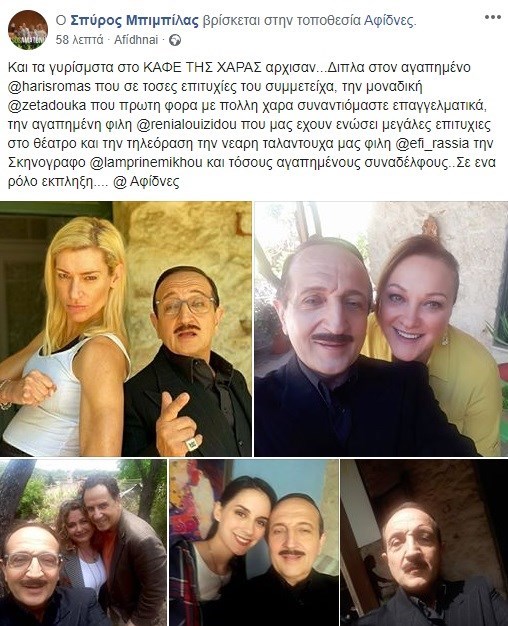 «Και τα γυρίσματα στο ΚΑΦΕ ΤΗΣ ΧΑΡΑΣ άρχισαν… Διπλά στον αγαπημένο @harisromas που σε τόσες επιτυχίες του συμμετείχα, την μοναδική @zetadouka που πρώτη φορά με πολλή χαρά συναντιόμαστε επαγγελματικά, την αγαπημένη φίλη @renialouizidou που μας έχουν ενώσει μεγάλες επιτυχίες στο θέατρο και την τηλεόραση την νεαρή ταλαντούχα μας φίλη @efi_rassia την σκηνογράφο lamprinemikhou και τόσους αγαπημένους συναδέλφους… Σε ένα ρόλο έκπληξη….», έγραψε ο Σπύρος Μπιμπίλας στη λεζάντα της ανάρτησής του.